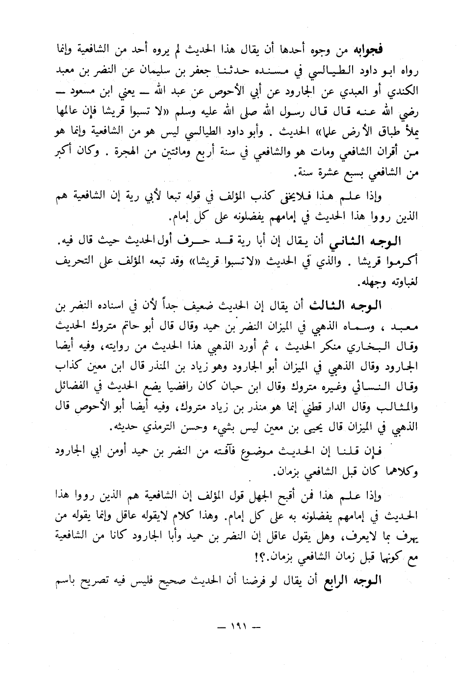 فجوابه من وجوه أحدها أن يقال هذا الحديث لم يروه أحد من الشافعية وإنما رواه أبو داود الطيالسي في مسنده حدثنا جعفر بن سليمان عن النضر بن معبد الكندي أو العبدي عن الجارود عن أبي الأحوص عن عبد الله - يعني ابن مسعود - رضي الله عنه قال قال رسول الله صلى الله عليه وسلم «لا تسبوا قريشا فإِن عالمها يملأ طباق الأرض علما» الحديث. وأبو داود الطيالسي ليس هو من الشافعية وإنما هو من أقران الشافعي ومات هو والشافعي في سنة أربع ومائتين من الهجرة. وكان أكبر من الشافعي بسبع عشرة سنة.