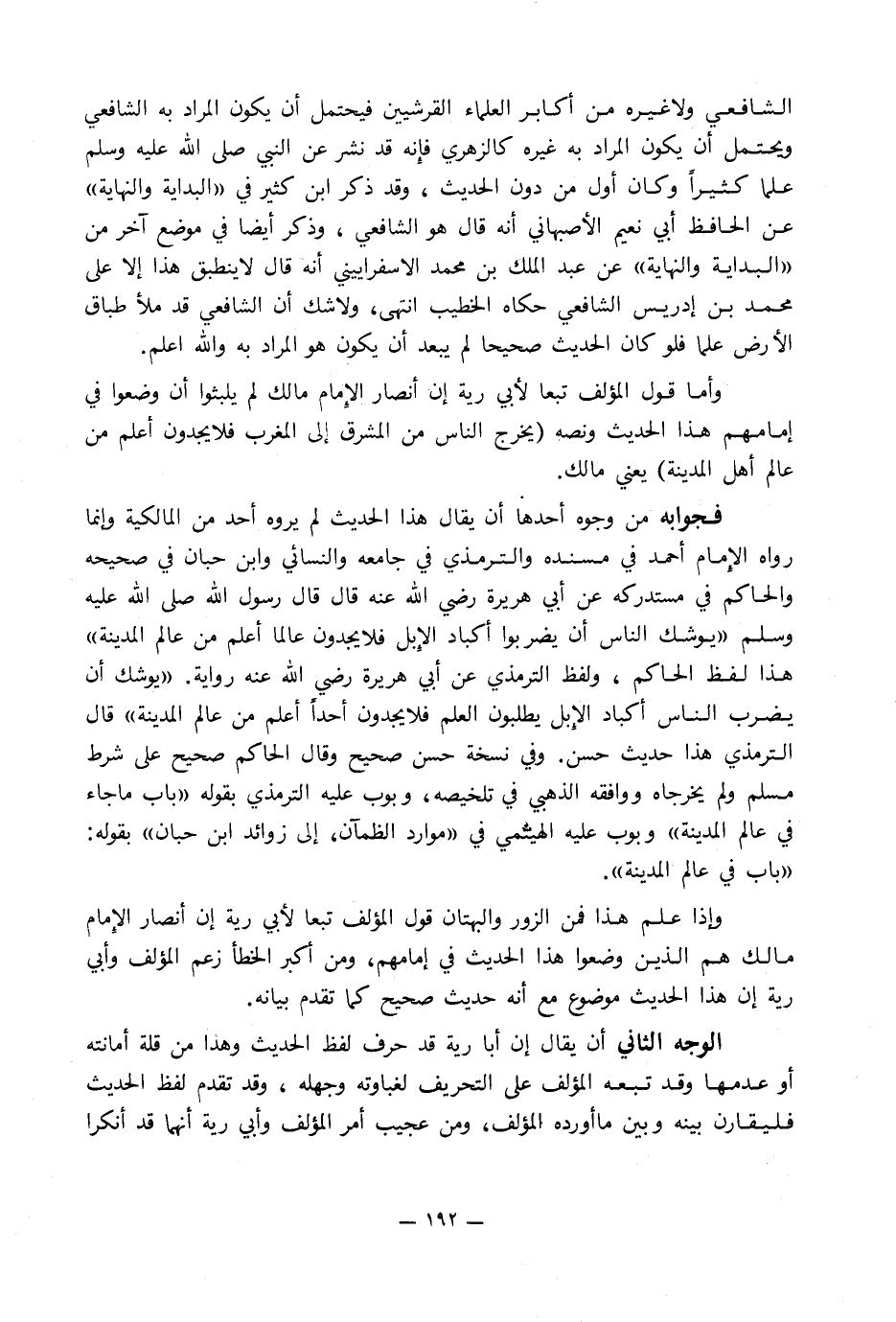 فجوابه من وجوه أحدها أن يقال هذا الحديث لم يروه أحد من المالكية وإنما رواه الإِمام أحمد في مسنده والترمذي في جامعه والنسائي وابن حبان في صحيحه والحاكم في مستدركه عن أبي هريرة رضي الله عنه قال قال رسول الله صلى الله عليه وسلم «يوشك الناس أن يضربوا أكباد الإِبل فلا يجدون عالما أعلم من عالم المدينة» هذا لفظ الحاكم, ولفظ الترمذي عن أبي هريرة رضي الله عنه رواية. «يوشك أن يضرب الناس أكباد الإِبل يطلبون العلم فلا يجدون أحداً أعلم من عالم المدينة» قال الترمذي هذا حديث حسن. وفي نسخة حسن صحيح وقال الحاكم صحيح على شرط مسلم ولم يخرجاه ووافقه الذهبي في تلخيصه, وبوب عليه الترمذي بقوله «باب ما جاء في عالم المدينة» وبوب عليه الهيثمي في «موارد الظمآن» إلى زوائد ابن حبان» بقوله: «باب في عالم المدينة».