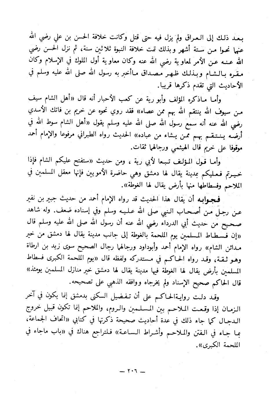 فجوابه أن يقال هذا الحديث قد رواه الإِمام أحمد من حديث جبير بن نفير عن رجل من أصحاب النبي صلى الله عليه وسلم وفي إسناده ضعف. وله شاهد صحيح من حديث أبي الدرداء رضي الله عنه أن رسول الله صلى الله عليه وسلم قال «إن فسطاط المسلمين يوم الملحمة بالغوطة إلى جانب مدينة يقال لها دمشق من خير مدائن الشام» رواه الإِمام أحمد وأبو داود ورجالهما رجال الصحيح سوى زيد بن أرطأة وهو ثقة, وقد رواه الحاكم في مستدركه ولفظه قال «يوم الملحمة الكبرى فسطاط المسلمين بأرض يقال لها الغوطة فيها مدينة يقال لها دمشق خير منازل المسلمين يومئذ» قال الحاكم صحيح الإِسناد ولم يخرجاه ووافقه الذهبي على تصحيحه.