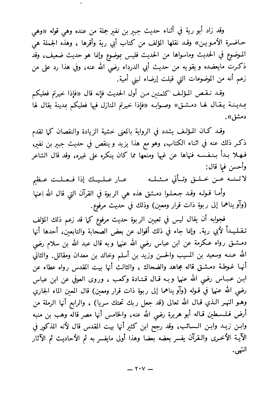 وقد زاد أبو رية في أثناء حديث جبير بن نفير جملة من عنده وهي قوله «وهي حاضرة الأمويين» وقد نقلها المؤلف من كتاب أبي رية وأقرها, وهذه الجملة هي الموضوع في الحديث وما سواها من الحديث فليس بموضوع وإنما هو حديث ضعيف, وقد ذكرت ما يعضده ويقويه من حديث أبي الدرداء رضي الله عنه, وفي هذا رد على من زعم أنه من الموضوعات التي قيلت إرضاء لبني أمية.