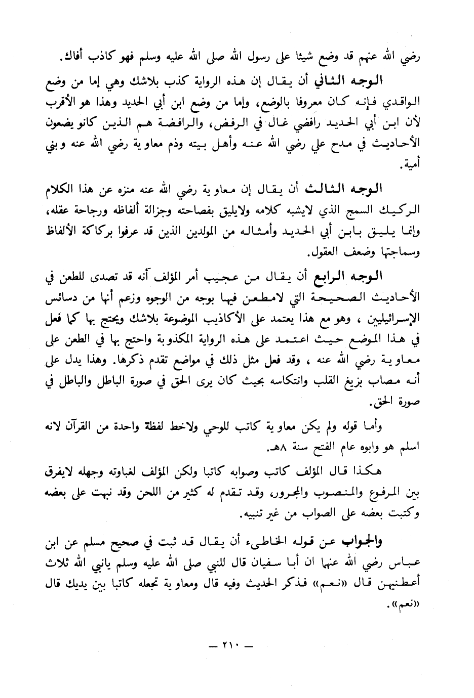 الوجه الرابع أن يقال من عجيب أمر المؤلف أنه قد تصدى للطعن في الأحاديث الصحيحة التي لا مطعن فيها بوجه من الوجوه وزعم أنها من دسائس الإِسرائيليين, وهو مع هذا يعتمد على الأكاذيب الموضوعة بلا شك ويحتج بها كما فعل في هذا الموضع حيث اعتمد على هذه الرواية المكذوبة واحتج بها في الطعن على معاوية رضي الله عنه, وقد فعل مثل ذلك في مواضع تقدم ذكرها. وهذا يدل على أنه مصاب بزيغ القلب وانتكاسه بحيث كان يرى الحق في صورة الباطل والباطل في صورة الحق.
