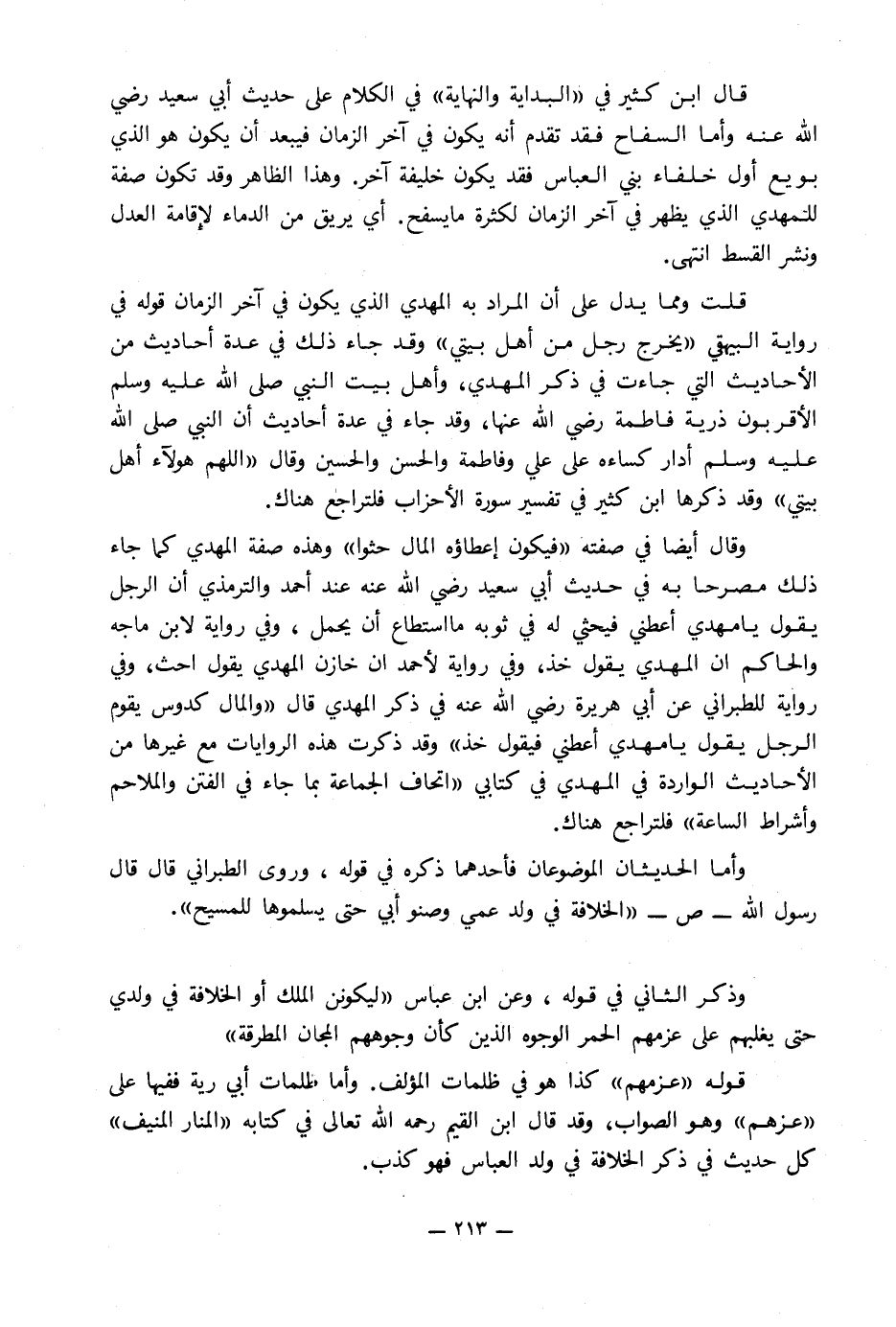 قلت ومما يدل على أن المراد به المهدي الذي يكون في آخر الزمان قوله في رواية البيهقي «يخرج رجل من أهل بيتي» وقد جاء ذلك في عدة أحاديث من الأحاديث التي جاءت في ذكر المهدي, وأهل بيت النبي صلى الله عليه وسلم الأقربون ذرية فاطمة رضي الله عنها, وقد جاء في عدة أحاديث أن النبي صلى الله عليه وسلم أدار كساءه على علي وفاطمة والحسن والحسين وقال «اللهم هؤلاء أهل بيتي» وقد ذكرها ابن كثير في تفسير سورة الأحزاب فلتراجع هناك.