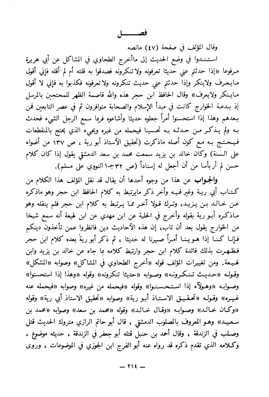 والجواب عن هذا من وجوه أحدها أن يقال قد نقل المؤلف هذا الكلام من كتاب أبي رية وغير فيه وأخر ذكر ما يرتبط به كلام الحافظ ابن حجر وهو ما ذكره عن خالد بن يزيد, وترك قولا آخر مما يرتبط به كلام ابن حجر فلم ينقله وهو ما ذكره أبو رية بقوله وأخرج في الحلية عن ابن مهدي عن ابن لهيعة أنه سمع شيخا من الخوارج يقول بعد أن تاب, إن هذه الأحاديث دين فانظروا عمن تأخذون دينكم فإِنا كنا إذا هوينا أمراً صيرنا له حديثا, ثم ذكر أبو رية بعده كلام ابن حجر فظهرت بذلك فائدة كلام ابن حجر وارتبط كلامه بما جاء عن خالد بن يزيد وابن لهيعة. ومن تغييرات المؤلف قوله «أخرج الطحاوي في المشاكل» وصوابه «المشكل» وقوله «حديث تنكرونه» وصوابه «حديثا تنكرونه» وقوله «وهذا إذا استحسنوا» وصوابه «وهؤلاء إذا استحسنوا» وقوله «فيحمله من غيره» وصوابه «فيحمله عنه غيره» وقوله «تحقيق الأستاذ أبو رية» وصوابه «تحقيق الأستاذ أبي رية» وقوله «وكان خالد» وصوابه «وقال خالد» وقوله «محمد بن سعد» وصوابه «محمد بن سعيد» وهو المعروف بالمصلوب الدمشقي, قال أبو حاتم الرازي متروك الحديث قتل وصلب في الزندقة, وقال أحمد بن حنبل قتله أبو جعفر في الزندقة, حديثه موضوع, وكلامه الذي تقدم ذكره قد رواه عنه أبو الفرج ابن الجوزي في الموضوعات, وروى