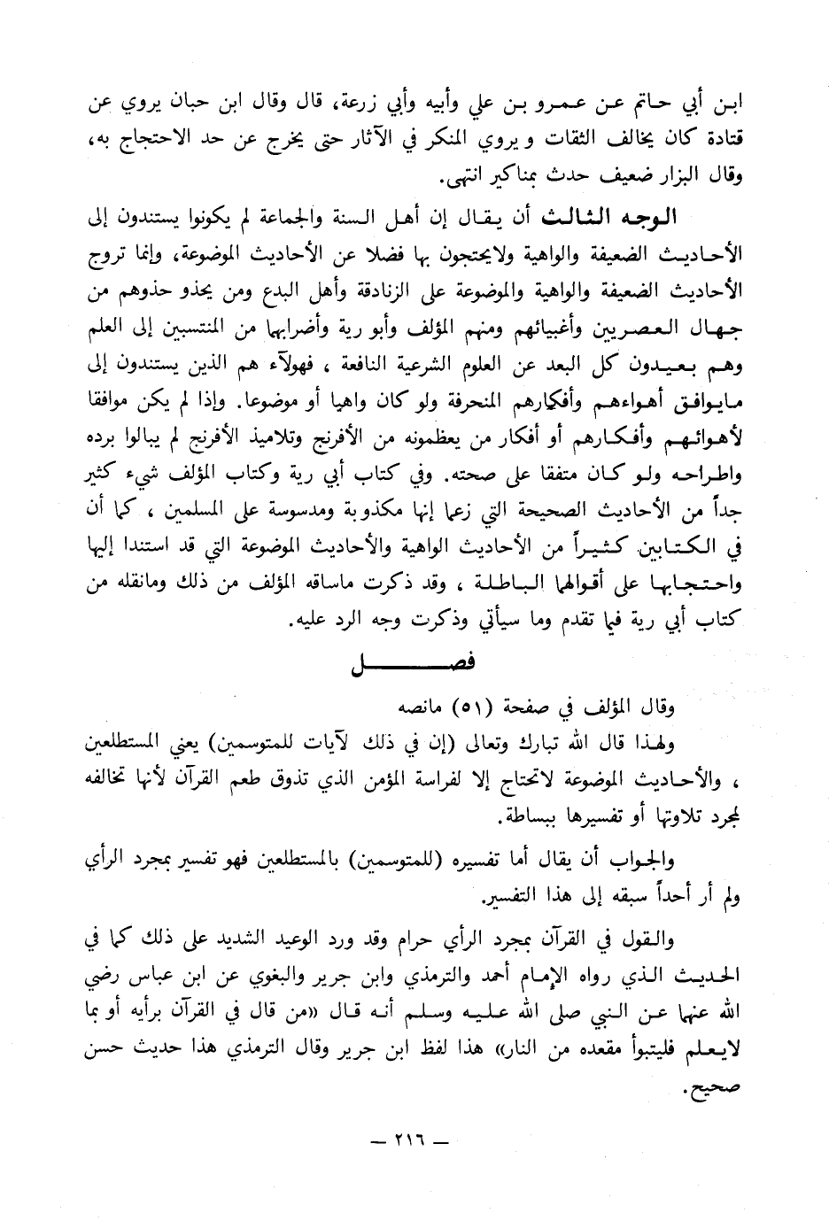 الوجه الثالث أن يقال إن أهل السنة والجماعة لم يكونوا يستندون إلى الأحاديث الضعيفة والواهية ولا يحتجون بها فضلا عن الأحاديث الموضوعة, وإنما تروج الأحاديث الضعيفة والواهية والموضوعة على الزنادقة وأهل البدع ومن يحذو حذوهم من جهال العصريين وأغبيائهم ومنهم المؤلف وأبو رية وأضرابهما من المنتسبين إلى العلم وهم بعيدون كل البعد عن العلوم الشرعية النافعة, فهؤلاء هم الذين يستندون إلى ما يوافق أهواءهم وأفكارهم المنحرفة ولو كان واهيا أو موضوعا. وإذا لم يكن موافقا لأهوائهم وأفكارهم أو أفكار من يعظمونه من الإفرنج وتلاميذ الإفرنج لم يبالوا برده واطراحه ولو كان متفقا على صحته. وفي كتاب أبي رية وكتاب المؤلف شيء كثير جداً من الأحاديث الصحيحة التي زعما إنها مكذوبة ومدسوسة على المسلمين, كما أن في الكتابين كثيراً من الأحاديث الواهية والأحاديث الموضوعة التي قد استندا إليها واحتجا بها على أقوالهما الباطلة, وقد ذكرت ما ساقه المؤلف من ذلك وما نقله من كتاب أبي رية فيما تقدم وما سيأتي وذكرت وجه الرد عليه.