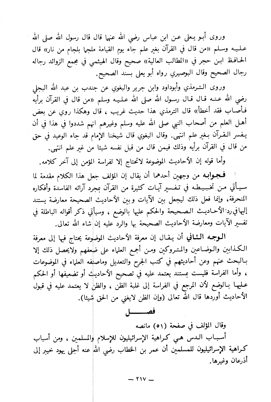 فجوابه من وجهين أحدهما أن يقال إن المؤلف جعل هذا الكلام مقدمة لما سيأتي من تخبيطه في تفسير آيات كثيرة من القرآن بمجرد آرائه الفاسدة وأفكاره المنحرفة, وإنما فعل ذلك ليجعل بين الآيات وبين الأحاديث الصحيحة معارضة يستند إليها في رد الأحاديث الصحيحة والحكم عليها بالوضع, وسيأتي ذكر أقواله الباطلة في تفسير الآيات ومعارضة الأحاديث الصحيحة بها والرد عليه إن شاء الله تعالى.