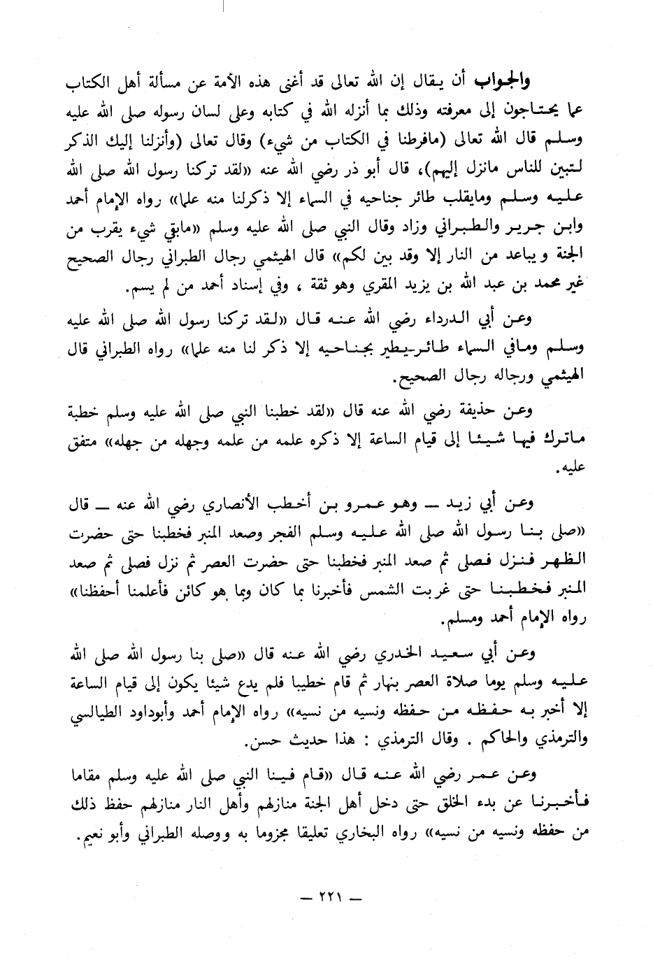 وعن أبي الدرداء رضي الله عنه قال «لقد تركنا رسول الله صلى الله عليه وسلم وما في السماء طائر يطير بجناحيه إلا ذكر لنا منه علما» رواه الطبراني قال الهيثمي ورجاله رجال الصحيح.
