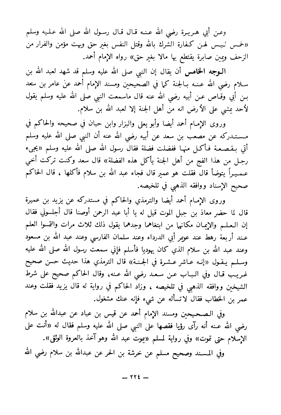 الوجه الخامس أن يقال إن النبي صلى الله عليه وسلم قد شهد لعبد الله بن سلام رضي الله عنه بالجنة كما في الصحيحين ومسند الإِمام أحمد عن عامر بن سعد بن أبي وقاص عن أبيه رضي الله عنه قال ما سمعت النبي صلى الله عليه وسلم يقول لأحد يمشي على الأرض إنه من أهل الجنة إلا لعبد الله بن سلام.
