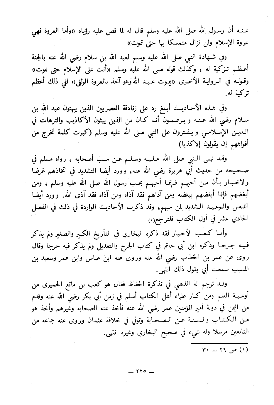 وفي شهادة النبي صلى الله عليه وسلم لعبد الله بن سلام رضي الله عنه بالجنة أعظم تزكية له, وكذلك قوله صلى الله عليه وسلم «أنت على الإِسلام حتى تموت» وقوله في الرواية الأخرى «يموت عبد الله وهو آخذ بالعروة الوثقى» ففي ذلك أعظم تزكية له.
