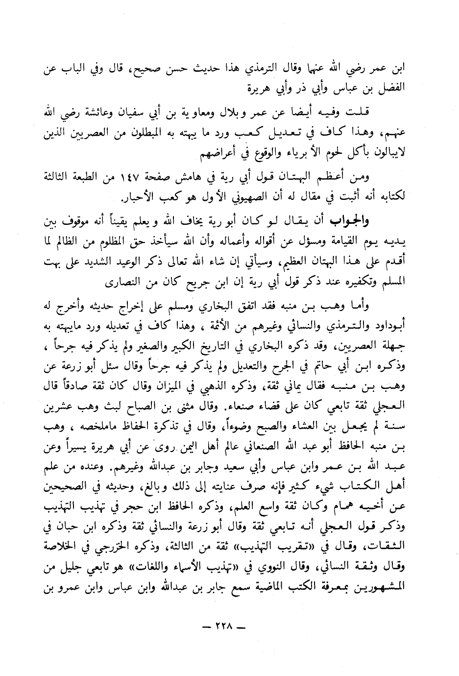 وأما وهب بن منبه فقد اتفق البخاري ومسلم على إخراج حديثه وأخرج له أبو داود والترمذي والنسائي وغيرهم من الأئمة, وهذا كاف في تعديله ورد ما يبهته به جهلة العصريين, وقد ذكره البخاري الكبير والصغير ولم يذكر فيه جرحاً, وذكره ابن أبي حاتم في الجرح والتعديل ولم يذكر فيه جرحاً وقال سئل أبو زرعة عن وهب بن منبه فقال يماني ثقة, وذكره الذهبي في الميزان وقال كان ثقة صادقاً قال العجلي ثقة تابعي كان على قضاء صنعاء. وقال مثنى بن الصباح لبث وهب عشرين سنة لم يجعل بين العشاء والصبح وضوءاً, وقال في تذكرة الحفاظ ما ملخصه, وهب بن منبه الحافظ أبو عبد الله الصنعاني عالم أهل اليمن روى عن أبي هريرة يسيراً وعن عبد الله بن عمر وابن عباس وأبي سعيد وجابر بن عبد الله وغيرهم. وعنده من علم أهل الكتاب شيء كثير فإِنه صرف عنايته إلى ذلك وبالغ, وحديثه في الصحيحين عن أخيه همام وكان ثقة واسع العلم, وذكره الحافظ ابن حجر في تهذيب التهذيب وذكر قول العجلي أنه تابعي ثقة وقال أبو زرعة والنسائي ثقة وذكره ابن حبان في الثقات, وقال في «تقريب التهذيب» ثقة من الثالثة, وذكره الخزرجي في الخلاصة وقال وثقة النسائي, وقال النووي في «تهذيب الأسماء واللغات» هو تابعي جليل من المشهورين بمعرفة الكتب الماضية سمع جابر بن عبد الله وابن عباس وابن عمرو بن