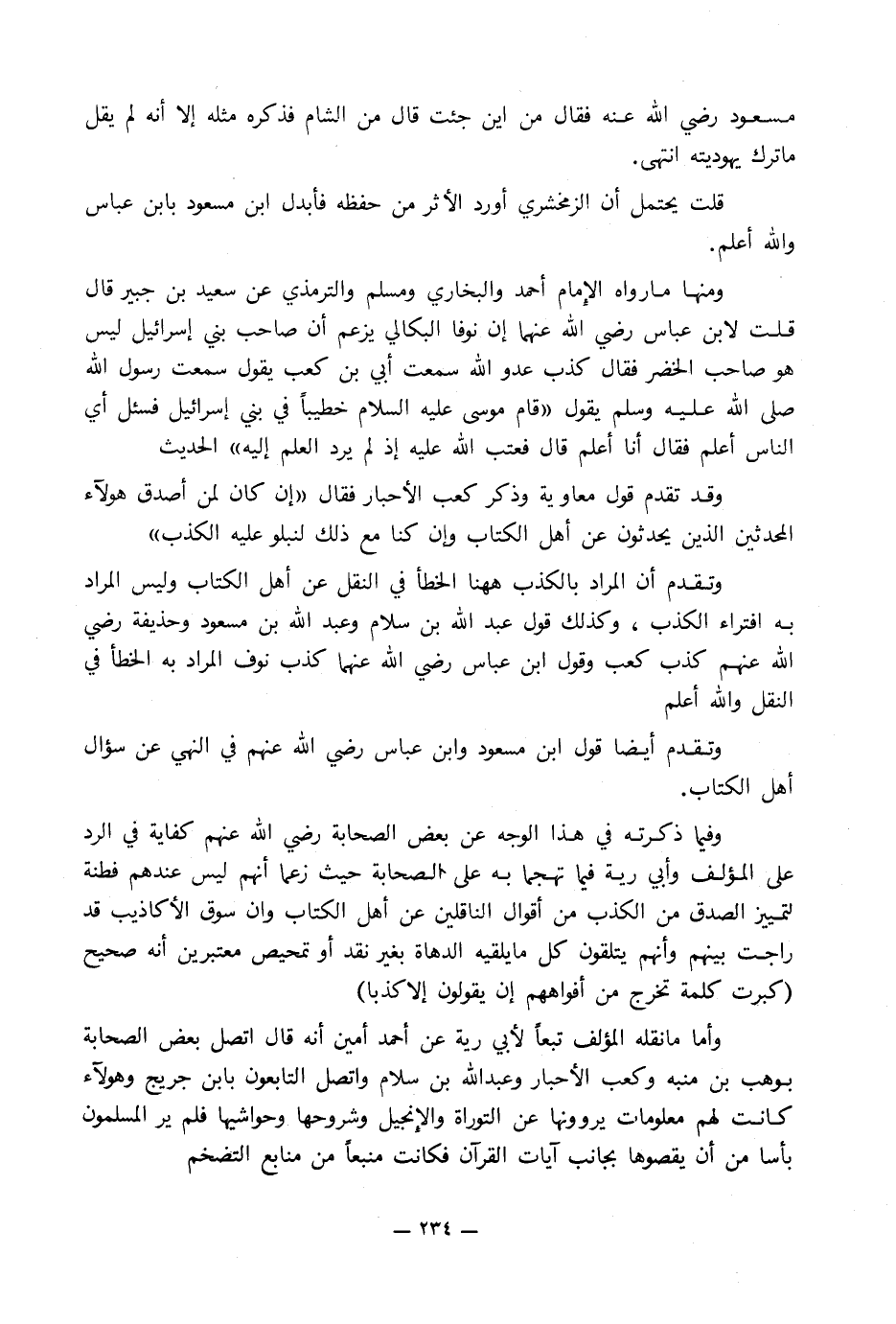 ومنها ما رواه الإِمام أحمد والبخاري ومسلم والترمذي عن سعيد بن جبير قال قلت لابن عباس رضي الله عنهما إن نوفا البكالي يزعم أن صاحب بني إسرائيل ليس هو صاحب الخضر فقال كذب عدو الله سمعت أبي بن كعب يقول سمعت رسول الله صلى الله عليه وسلم يقول «قام موسى عليه السلام خطيباً في بني إسرائيل فسئل أي الناس أعلم فقال أنا أعلم قال فعتب الله عليه إذ لم يرد العلم إليه» الحديث وقد تقدم قول معاوية وذكر كعب الأحبار فقال «إن كان لمن أصدق هؤلاء المحدثين الذين يحدثون عن أهل الكتاب وإن كنا مع ذلك لنبلو عليه الكذب».