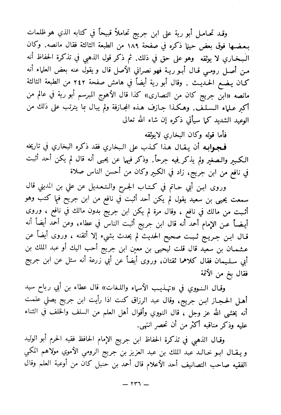 فجوابه أن يقال هذا كذب على البخاري فقد ذكره البخاري في تاريخه الكبير والصغير ولم يذكر - فيه جرحاً. وذكر فيهما عن يحيى أنه قال لم يكن أحد أثبت في نافع من ابن جريج, زاد في الكبير وكان من أحسن الناس صلاة.