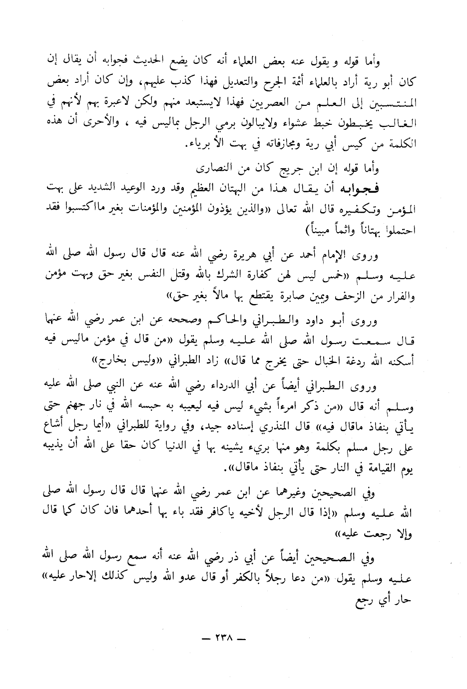 فجوابه أن يقال هذا من البهتان العظيم وقد ورد الوعيد الشديد على بهت المؤمن وتكفيره قال الله تعالى (والذين يؤذون المؤمنين والمؤمنات بغير ما اكتسبوا فقد احتملوا بهتاناً وإثماً مبيناً).