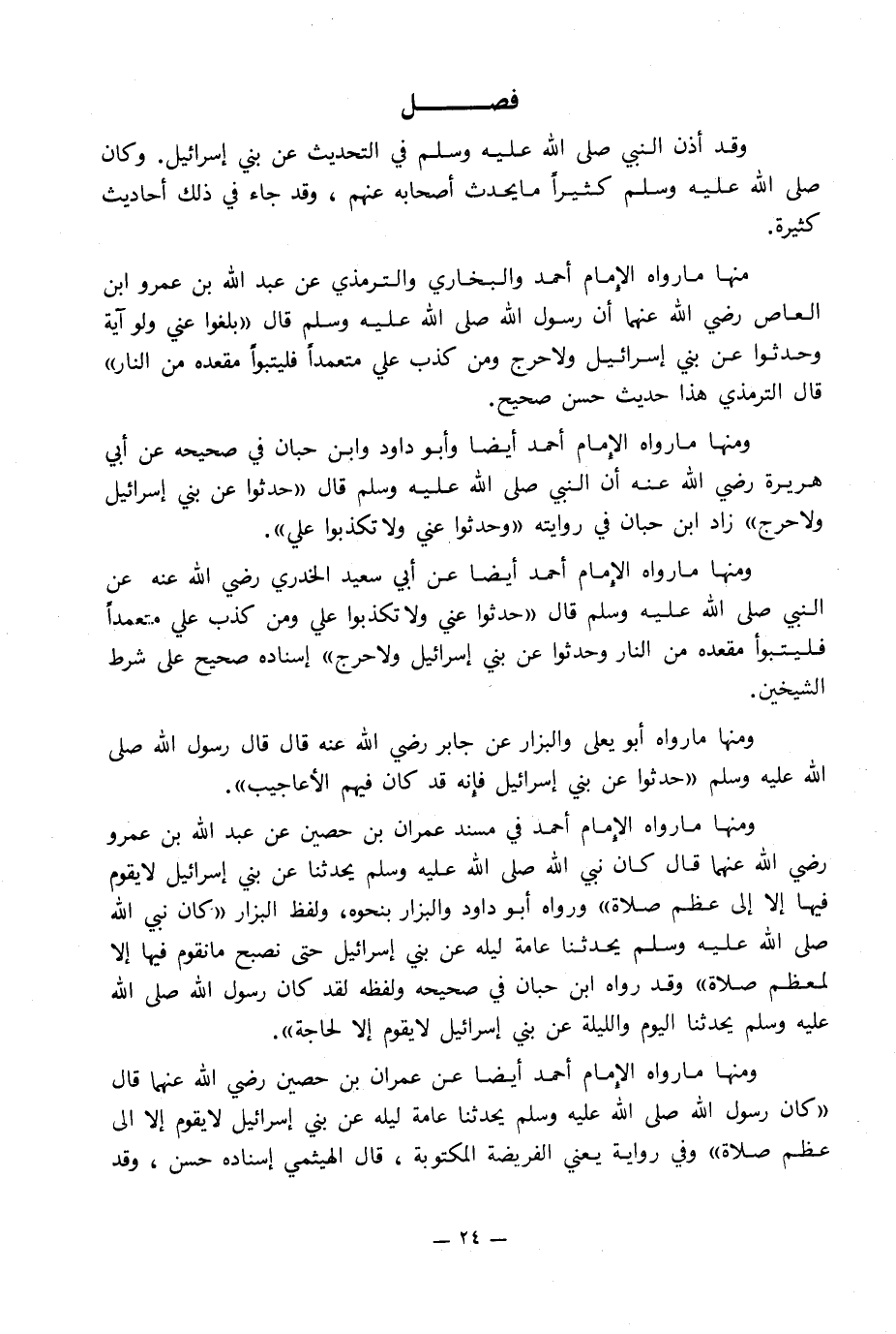 ومنها ما رواه الإِمام أحمد في مسند عمران بن حصين عن عبد الله بن عمرو رضي الله عنهما قال كان نبي الله صلى الله عليه وسلم يحدثنا عن بني إسرائيل لا يقوم فيها إلا إلى عظم صلاة» ورواه أبو داود والبزار بنحوه, ولفظ البزار «كان نبي الله صلى الله عليه وسلم يحدثنا عامة ليله عن بني إسرائيل حتى نصبح ما نقوم فيها إلى لمعظم صلاة» وقد رواه ابن حبان في صحيحه ولفظه لقد كان رسول الله صلى الله عليه وسلم يحدثنا اليوم والليلة عن بني إسرائيل لا يقوم إلا لحاجة».