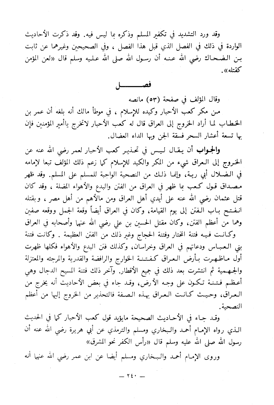 والجواب أن يقال ليس في تحذير كعب الأحبار لعمر رضي الله عنه عن الخروج إلى العراق شيء من المكر للإِسلام كما زعم ذلك المؤلف تبعا لإِمامه في الضلال أبي رية, وإنما ذلك من النصيحة الواجبة للمسلم على المسلم. وقد ظهر مصداق قول كعب بما ظهر في العراق من الفتن والبدع والأهواء المضلة, وقد كان قتل عثمان رضي الله عنه على أيدي أهل العراق ومن مالألهم من أهل مصر, وبقتله انفتح باب الفتن إلى يوم القيامة, وكان في العراق أيضاً وقعة الجمل ووقعه صفين وهما من أعظم الفتن, وكان مقتل الحسين بن علي الله عنهما وأصحابه في العراق وكانت فيه فتنة المختار وفتنة الحجاج وغير ذلك من الفتن العظيمة. وكانت فتنة بني العباس ودعاتهم في العراق وخراسان, وكذلك فتن البدع والأهواء فكلها ظهرت أو ما ظهرت بأرض العراق كفتنة الخوارج والرافضة والقدرية والمرجئة والمعتزلة والجهمية ثم انتشرت بعد ذلك في جميع الأقطار. وآخر ذلك فتنة المسيح الدجال وهي أعظم فتنة تكون على وجه الأرض, وقد جاء في بعض الأحاديث أنه يخرج من العراق, وحيث كانت العراق بهذه الصفة فالتحذير من الخروج إليها من أعظم النصيحة.