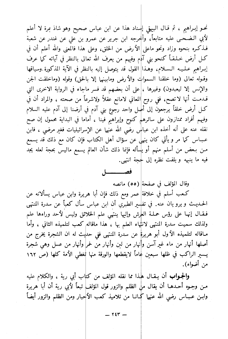 والجواب أن يقال هذا مما نقله المؤلف من كتاب أبي رية, والكلام عليه من وجوه أحدها أن يقال من الظلم والزور قول المؤلف تبعاً لأبي رية أنا أبا هريرة وابن عباس رضي الله عنهما كانا من تلاميذ كعب الأحبار ومن الظلم والزور أيضاً