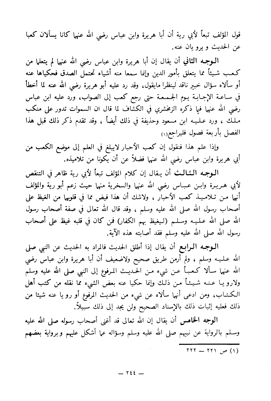 الوجه الرابع أن يقال إذا أطلق الحديث فالمراد به الحديث عن النبي صلى الله عليه وسلم, ولم أر من طريق صحيح ولا ضعيف أنا أبا هريرة وابن عباس رضي الله عنهما سألا كعباً عن شيء من الحديث المرفوع إلى النبي صلى الله عليه وسلم ولا رويا عنه شيئاً من ذلك وإنما حكيا عنه بعض الشيء مما نقله من كتب أهل الكتاب, ومن ادعى أنهما سألاه عن شيء من الحديث المرفوع أو رويا عنه شيئا من ذلك فعليه إثبات ذلك بالإِسناد الصحيح ولن يجد إلى ذلك سبيلاً.