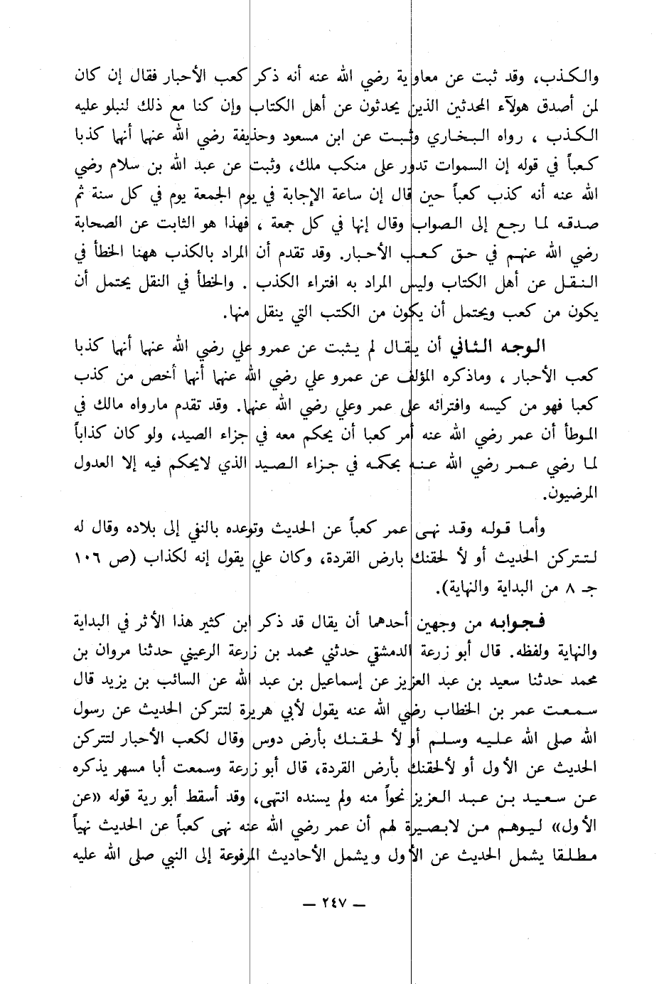 الوجه الثاني أن يقال لم يثبت عن عمر وعلي رضي الله عنهما أنهما كذبا كعب الأحبار, وما ذكره المؤلف عن عمر وعلي رضي الله عنهما أنهما أخص من كذب كعبا فهو من كيسه وافترائه على عمر وعلي رضي الله عنهما. وقد تقدم ما رواه مالك في الموطأ أن عمر رضي الله عنه أمر كعبا أن يحكم معه في جزاء الصيد, ولو كان كذاباً لما رضي عمر رضي الله عنه بحكمه في جزاء الصيد الذي لا يحكم فيه إلا العدول المرضيون.