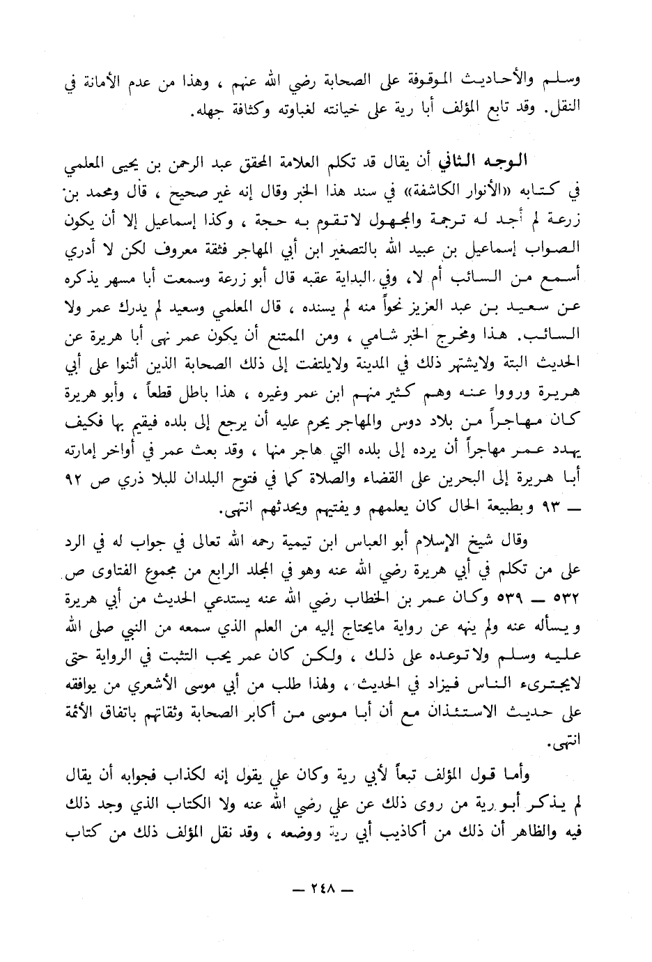 الوجه الثاني أن يقال قد تكلم العلامة المحقق عبد الرحمن بن يحيى المعلمي في كتابه «الأنوار الكاشفة» في سند هذا الخبر وقال إنه غير صحيح, قال ومحمد بن زرعة لم أجد له ترجمة والمجهول لا تقوم به حجة, وكذا إسماعيل إلا أن يكون الصواب إسماعيل بن عبيد الله بالتصغير ابن أبي المهاجر فثقة معروف لكن لا أدري أسمع من السائب أم لا, وفي البداية عقبه قال أبو زرعة وسمعت أبا مسهر يذكره عن سعيد بن عبد العزيز نحواً منه لم يسنده, قال المعلمي وسعيد لم يدرك عمر ولا السائب. هذا ومخرج الخبر شامي, ومن الممتنع أن يكون عمر نهى أبا هريرة عن الحديث البتة ولا يشتهر ذلك في المدينة ولا يلتفت إلى ذلك الصحابة الذين أثنوا على أبي هريرة ورووا عنه وهم كثير منهم ابن عمر وغيره, هذا باطل قطعاً وأبو هريرة كان مهاجراً من بلاد دوس والمهاجر يحرم عليه أن يرجع إلى بلده فيقيم بها فكيف يهدد عمر مهاجراً أن يرده إلى بلده التي هاجر منها, وقد بعث عمر في أواخر إمارته أبا هريرة إلى البحرين على القضاء والصلاة كما في فتوح البلدان للبلاذري ص 92 - 93 وبطبيعة الحال كان يعلمهم ويفتيهم ويحدثهم انتهى.