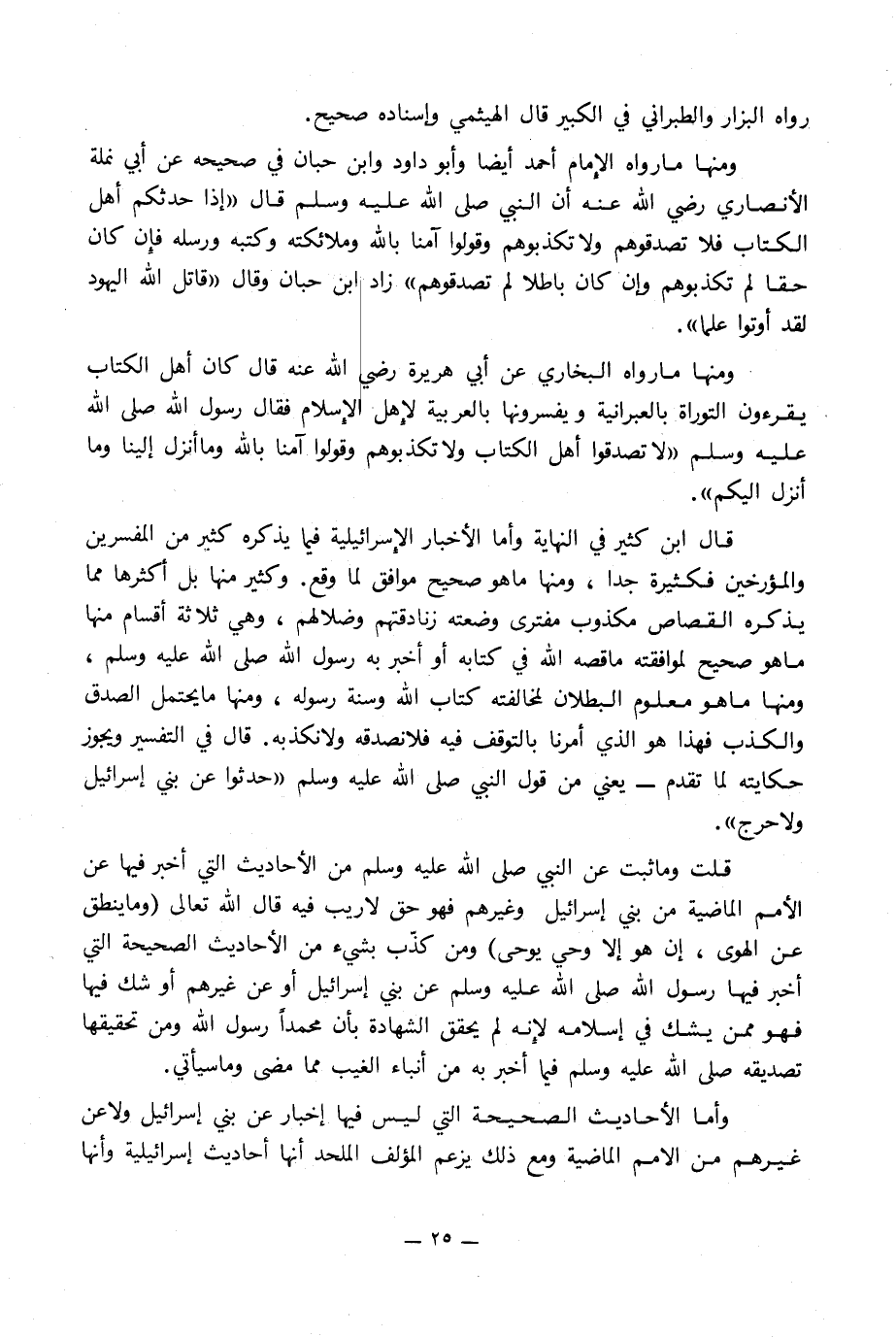 ومنها ما رواه الإِمام أحمد أيضا وأبو داود وابن حبان في صحيحه عن أبي نملة الأنصاري رضي الله عنه أن النبي صلى الله عليه وسلم قال «إذا حدثكم أهل الكتاب فلا تصدقوهم ولا تكذبوهم وقولوا آمنا بالله وملائكته وكتبه ورسله فإِن كان حقا لم تكذبوهم وإن كان باطلا لم تصدقوهم» زاد ابن حبان وقال «قاتل الله اليهود لقد أوتوا علما».