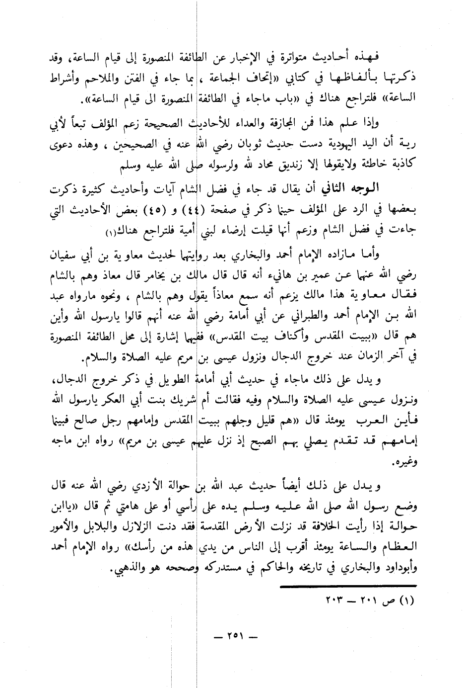 فهذه أحاديث متواترة في الإِخبار عن الطائفة المنصورة إلى قيام الساعة, وقد ذكرتها بألفاظها في كتابي «إتحاف الجماعة, بما جاء في الفتن والملاحم وأشراط الساعة» فتراجع هناك في «باب ما جاء في الطائفة المنصورة إلى قيام الساعة».