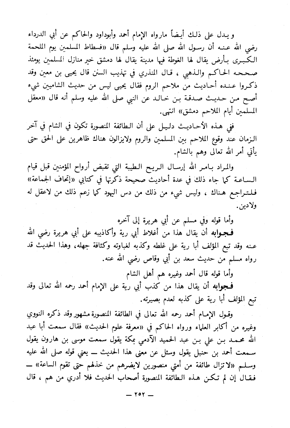وقول الإِمام أحمد رحمه الله تعالى في الطائفة المنصورة مشهور وقد ذكره النووي وغيره من أكابر العلماء ورواه الحاكم في «معرفة علوم الحديث» فقال سمعت أبا عبد الله محمد بن علي بن عبد الحميد الآدمي بمكة يقول سمعت موسى بن هارون يقول سمعت أحمد بن حنبل يقول وسئل عن معنى هذا الحديث - يعني قوله صلى الله عليه وسلم «لا تزال طائفة من أمتي منصورين لا يضرهم من خذلهم حتى تقوم الساعة» - فقال إن لم تكن هذه الطائفة المنصورة أصحاب الحديث فلا أدري من هم, قال