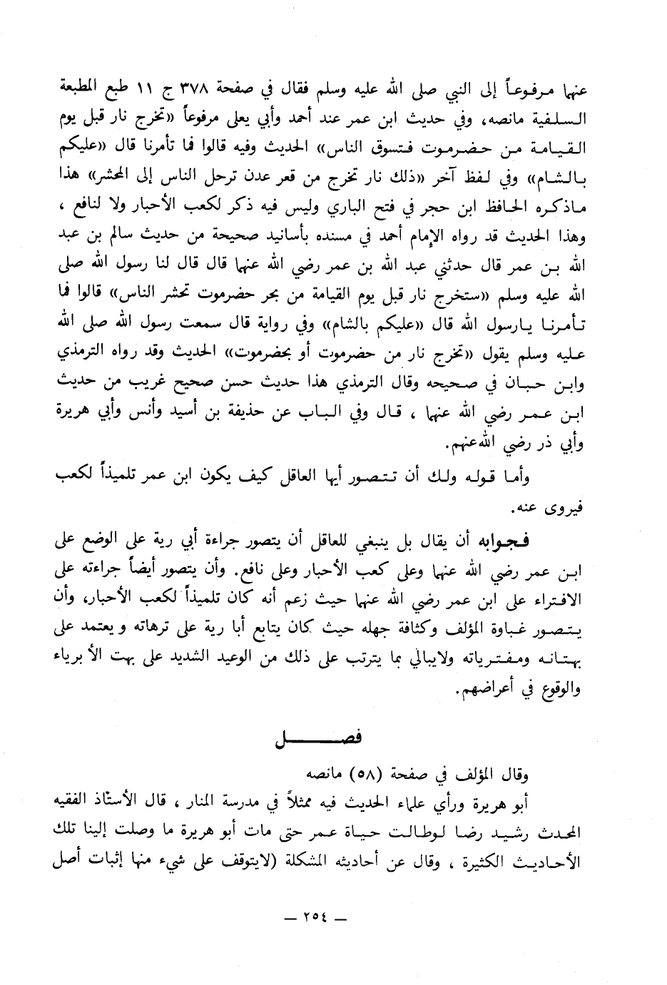 عنهما مرفوعاً إلى النبي صلى الله عليه وسلم فقال في صفحة 378 ج 11 طبع المطبعة السلفية ما نصه, وفي حديث ابن عمر عند أحمد وأبي يعلى مرفوعاً «تخرج نار قبل يوم القيامة من حضرموت فتسوق الناس» الحديث وفيه قالوا فما تأمرنا قال «عليكم بالشام» وفي لفظ آخر «ذلك نار تخرج من قعر عدن ترحل الناس إلى المحشر» هذا ما ذكره الحافظ ابن حجر في فتح الباري وليس فيه ذكر لكعب الأحبار ولا لنافع, وهذا الحديث قد رواه الإِمام أحمد في مسنده بأسانيد صحيحة من حديث سالم بن عبد الله بن عمر قال حدثني عبد الله بن عمر رضي الله عنهما قال قال لنا رسول الله صلى الله عليه وسلم «ستخرج نار قبل يوم القيامة من بحر حضرموت تحشر الناس» قالوا فما تأمرنا يا رسول الله قال «عليكم بالشام» وفي رواية قال سمعت رسول الله صلى الله عليه وسلم يقول «تخرج نار من حضرموت أو بحضرموت» الحديث وقد رواه الترمذي وابن حبان في صحيحه وقال الترمذي هذا حديث حسن صحيح غريب من حديث ابن عمر رضي الله عنهما, قال وفي الباب عن حذيفة بن أسيد وأنس وأبي هريرة وأبي ذر رضي الله عنهم.