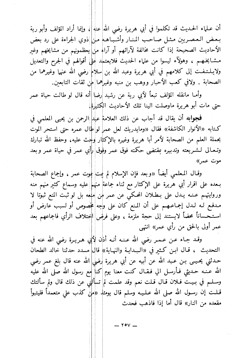 وقال المعلمي أيضاً «وبعد فإِن الإِسلام لم يمت بموت عمر, وإجماع الصحابة بعده على إقرار أبي هريرة على الإِكثار مع ثناء جماعة منهم عليه وسماع كثير منهم منه وروايتهم عنه يدل على بطلان المحكي عن عمر من منعه بل لو ثبت المنع ثبوتا لا مدفع له لدل إجماعهم على أن المنع كان على وجه مخصوص أو لسبب عارض أو استحساناً محضاً لا يستند إلى حجة ملزمة, وعلى فرض اختلاف الرأي فإجماعهم بعد عمر أولى بالحق من رأي عمر» انتهى.