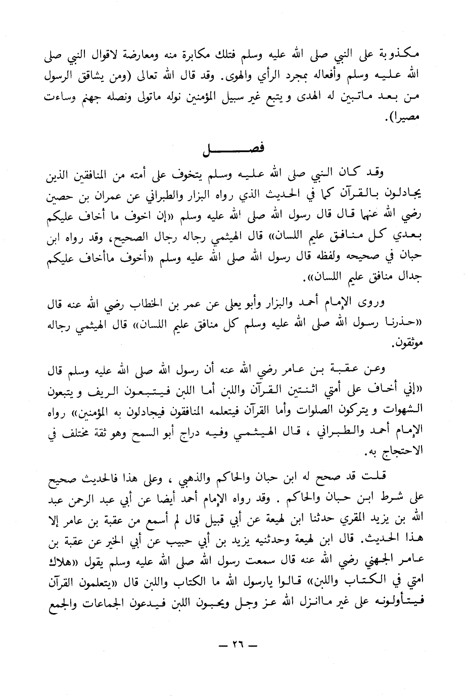 وعن عقبة بن عامر رضي الله عنه أن رسول الله صلى الله عليه وسلم قال «إني أخاف على أمتي اثنتين القرآن واللبن أما اللبن فيتبعون الريف ويتبعون الشهوات ويتركون الصلوات وأما القرآن فيتعلمه المنافقون فيجادلون به المؤمنين» رواه الإِمام أحمد والطبراني, قال الهيثمي وفيه دراج أبو السمح وهو ثقة مختلف في الاحتجاج به.
