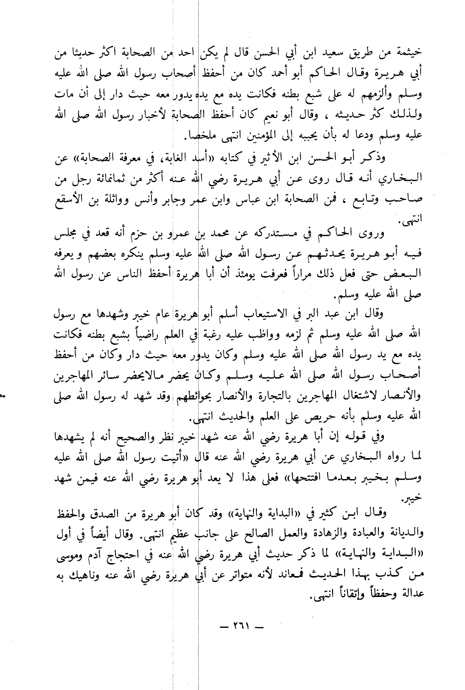 خيثمة من طريق سعيد ابن أبي الحسن قال لم يكن أحد من الصحابة أكثر حديثا من أبي هريرة وقال الحاكم أبو أحمد كان من أحفظ أصحاب رسول الله صلى الله عليه وسلم وألزمهم له على شبع بطنه فكانت يده مع يده يدور معه حيث دار إلى أن مات ولذلك كثر حديثه, وقال أبو نعيم كان أحفظ الصحابة لأخبار رسول الله صلى الله عليه وسلم ودعا له بأن يحببه إلى المؤمنين انتهى ملخصا.