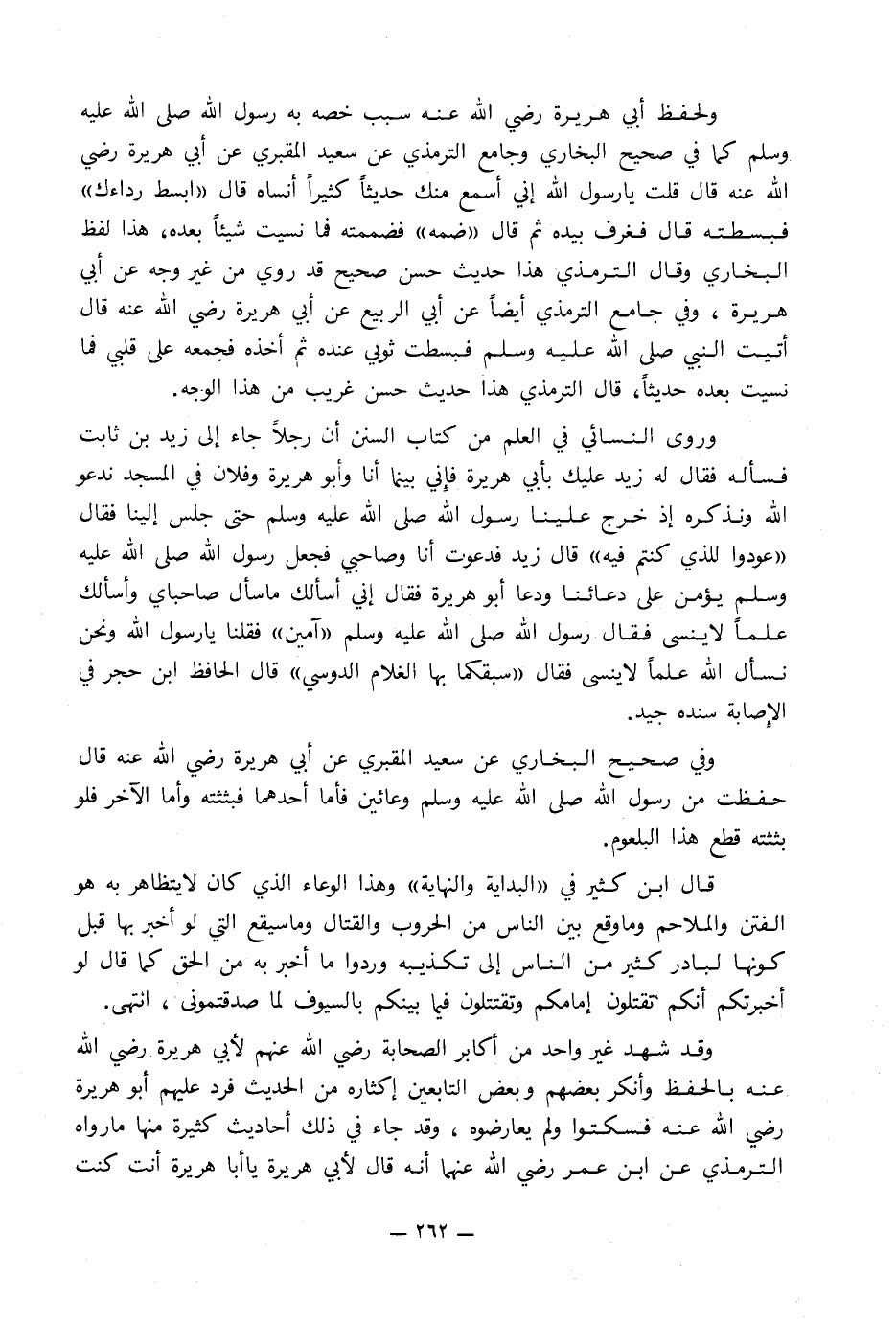 ولحفظ أبي هريرة رضي الله عنه سبب خصه به رسول الله صلى الله عليه وسلم كما في صحيح البخاري وجامع الترمذي عن سعيد المقبري عن أبي هريرة رضي الله عنه قال قلت يا رسول الله إني أسمع منك حديثاً كثيراً أنساه قال «ابسط رداءك» فبسطته قال فغرف بيده ثم قال «ضمه» فضممته فما نسيت شيئاً بعده, هذا لفظ البخاري وقال الترمذي هذا حديث حسن صحيح قد روي من غير وجه عن أبي هريرة, وفي جامع الترمذي أيضاً عن أبي الربيع عن أبي هريرة رضي الله عنه قال أتيت النبي صلى الله عليه وسلم فبسطت ثوبي عنده ثم أخذه فجمعه على قلبي فما نسيت بعده حديثاً, قال الترمذي هذا حديث حسن غريب من هذا الوجه.
