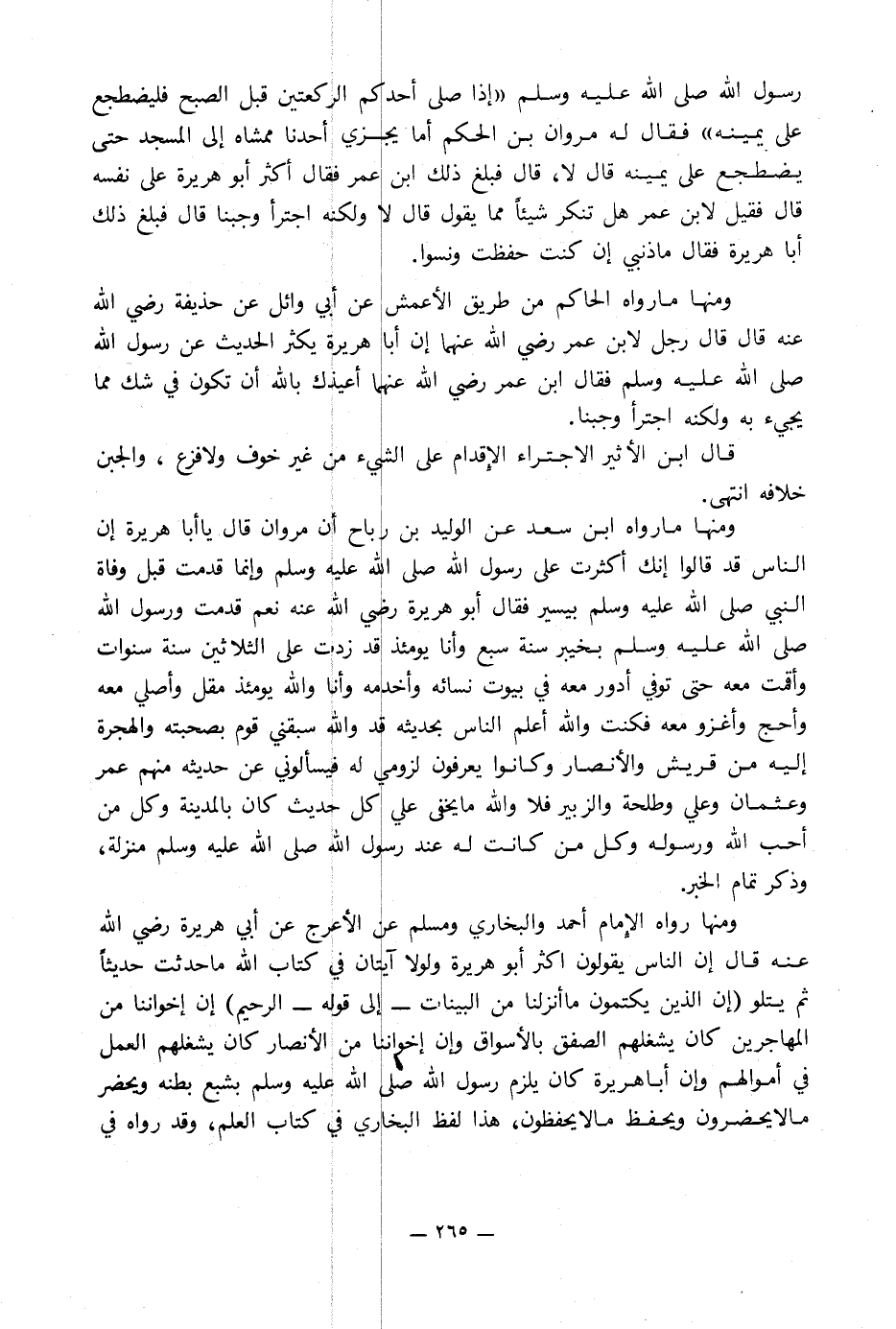 ومنها رواه الإِمام أحمد والبخاري ومسلم عن الأعرج عن أبي هريرة رضي الله عنه قال إن الناس يقولون أكثر أبو هريرة ولولا آيتان في كتاب الله ما حدثت حديثاً ثم يتلو (إن الذين يكتمون ما أنزلنا من البينات - إلى قوله - الرحيم) إن إخواننا من المهاجرين كان يشغلهم الصفق بالأسواق وإن إخواننا من الأنصار كان يشغلهم العمل في أموالهم وإن أبا هريرة كان يلزم رسول الله صلى الله عليه وسلم بشبع بطنه ويحضر ما لا يحضرون ويحفظ ما لا يحفظون, هذا لفظ البخاري في كتاب العلم, وقد رواه في