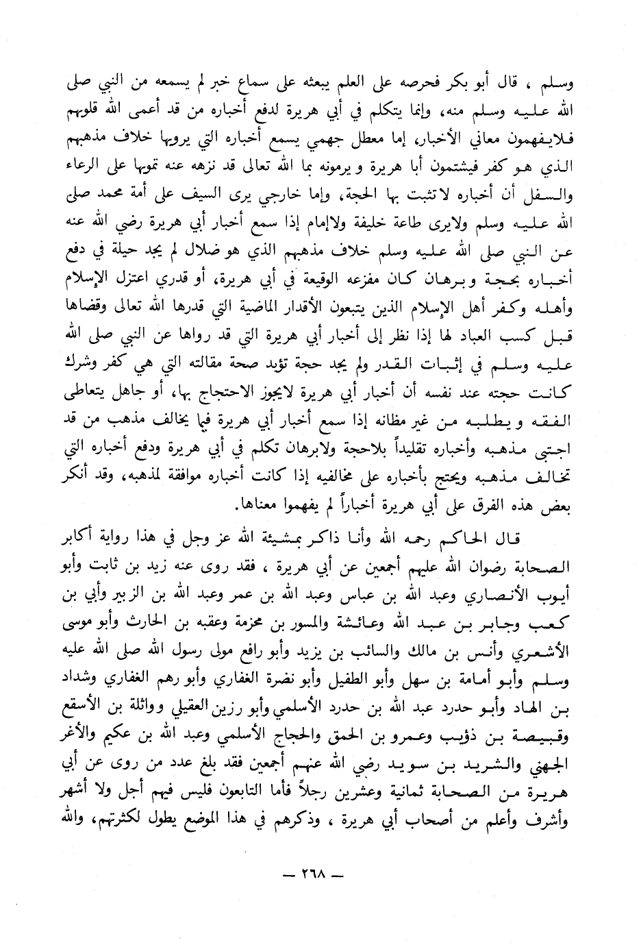 وسلم, قال أبو بكر فحرصه على العلم يبعثه على سماع خبر لم يسمعه من النبي صلى الله عليه وسلم منه, وإنما يتكلم في أبي هريرة لدفع أخباره من قد أعمى الله قلوبهم فلا يفهمون معاني الأخبار, إما معطل جهمي يسمع أخباره التي يرويها خلاف مذهبهم الذي هو كفر فيشتمون أبا هريرة ويرمونه بما الله تعالى قد نزهه عنه تمويها على الرعاء والسفل أن أخباره لا تثبت بها الحجة, وإما خارجي يرى السيف على أمة محمد صلى الله عليه وسلم ولا يرى طاعة خليفة ولا إمام إذا سمع أخبار أبي هريرة رضي الله عنه عن النبي صلى الله