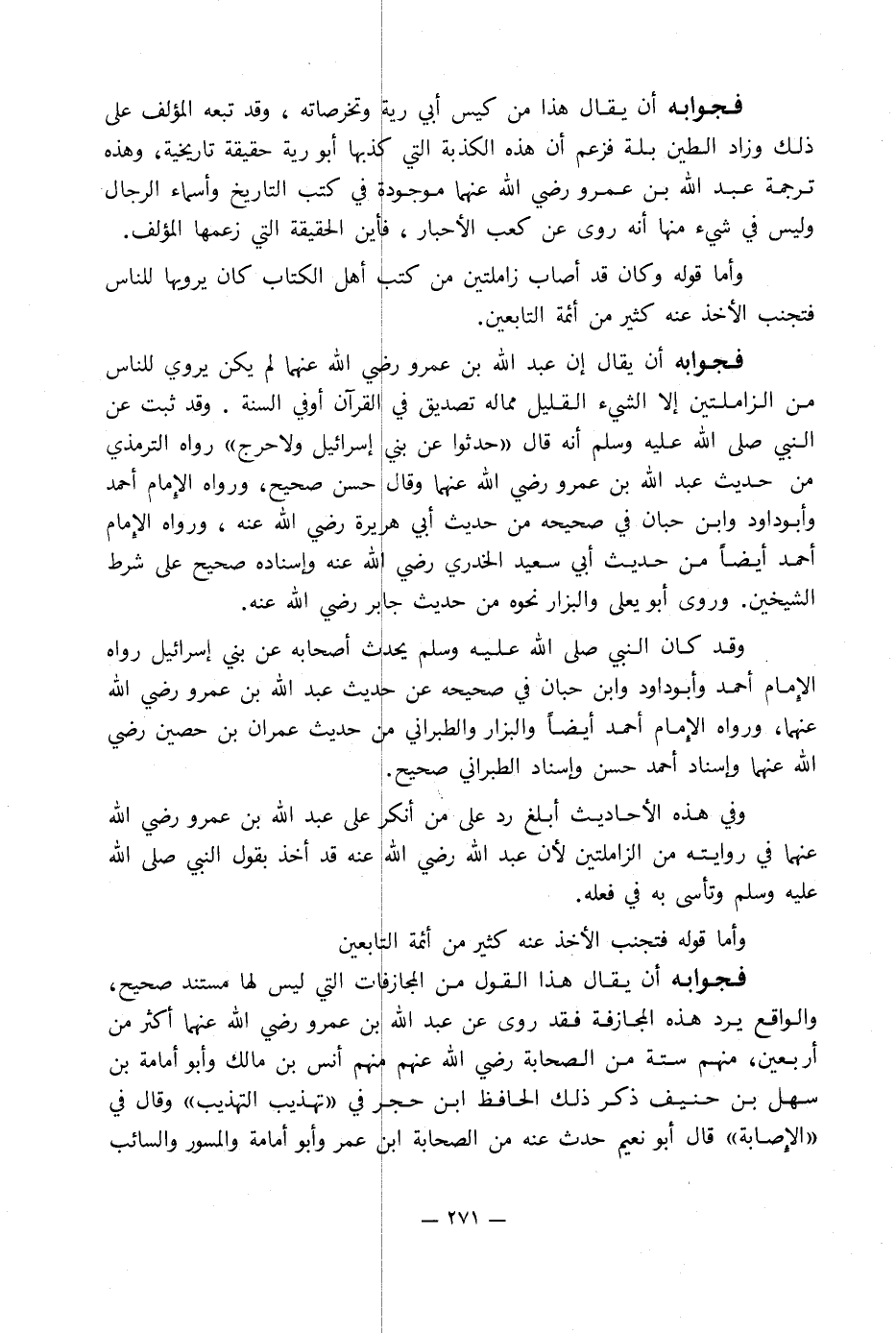فجوابه أن يقال هذا من كيس أبي رية وتخرصاته, وقد تبعه المؤلف على ذلك وزاد الطين بلة فزعم أن هذه الكذبة التي كذبها أبو رية حقيقة تاريخية, وهذه ترجمة عبد الله بن عمرو رضي الله عنهما موجودة في كتب التاريخ وأسماء الرجال وليس في شيء منها أنه روى عن كعب الأحبار, فأين الحقيقة التي زعمها المؤلف.