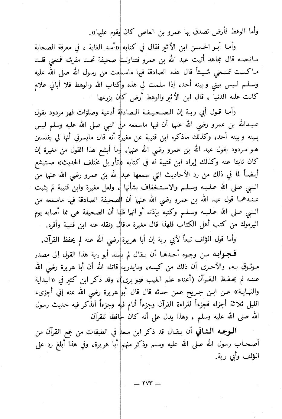 الوجه الثاني أن يقال قد ذكر ابن سعد في الطبقات من جمع القرآن من أصحاب رسول الله صلى الله عليه وسلم وذكر منهم أبا هريرة, وفي هذا أبلغ رد على المؤلف وأبي رية.