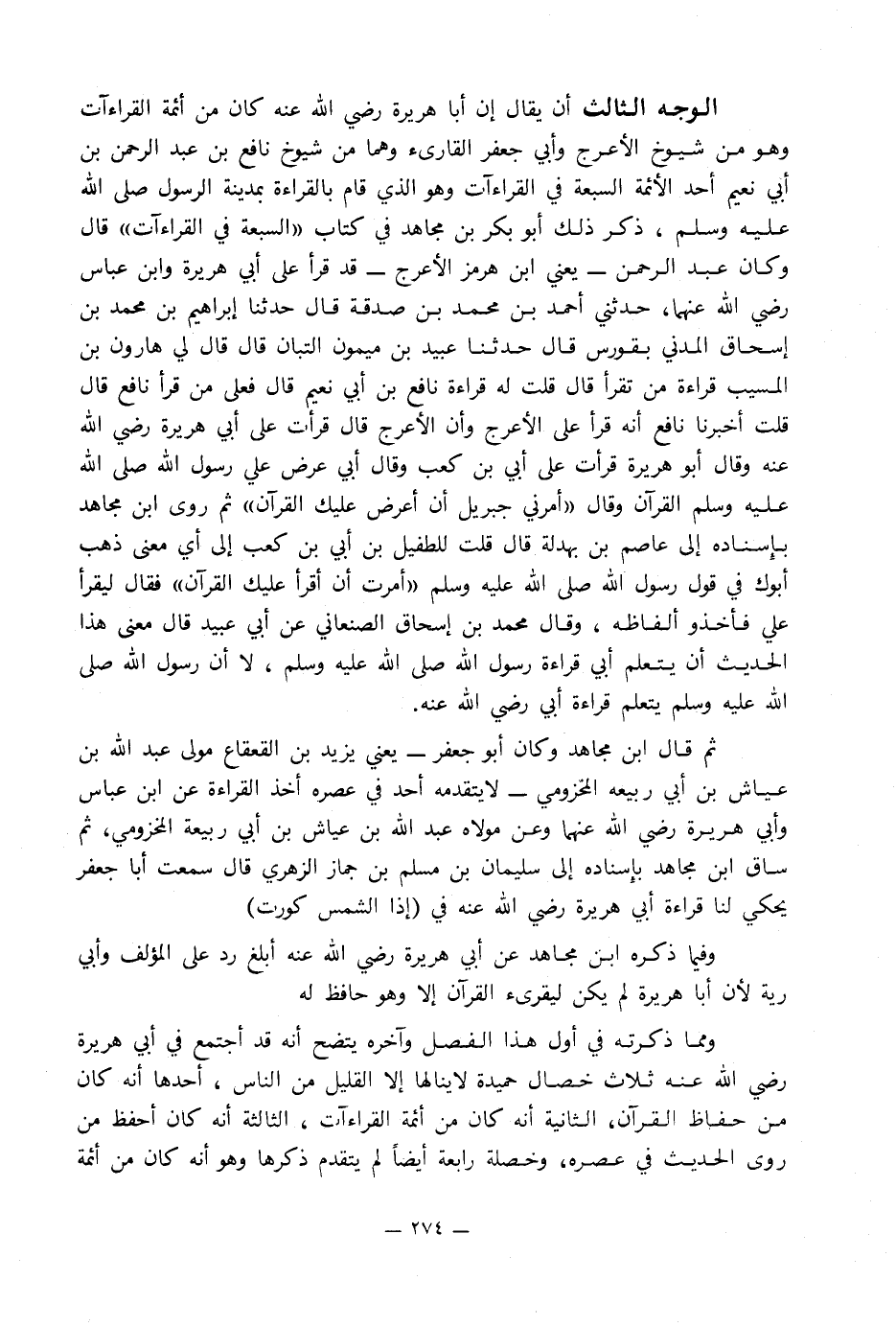 الوجه الثالث أن يقال إن أبا هريرة رضي الله عنه كان من أئمة القراءات وهو من شيوخ الأعرج وأبي جعفر القارئ وهما من شيوخ نافع بن عبد الرحمن بن أبي نعيم أحد الأئمة السبعة في القراءات وهو الذي قام بالقراءة بمدينة الرسول صلى الله عليه وسلم, ذكر ذلك أبو بكر بن مجاهد في كتاب «السبعة في القراءات» قال وكان عبد الرحمن - يعني ابن هرمز الأعرج - قد قرأ على أبي هريرة وابن عباس رضي الله عنهما, حدثني أحمد بن محمد بن صدقة قال حدثنا إبراهيم بن محمد بن إسحاق المدني بقورس قال حدثنا عبيد بن ميمون التبان قال قال لي هارون بن المسيب قراءة من تقرأ قال قلت له قراءة نافع بن أبي نعيم قال فعلى من قرأ نافع قال قلت أخبرنا نافع أنه قرأ على الأعرج وأن الأعرج قال قرأت على أبي هريرة رضي الله عنه وقال أبو هريرة قرأت على أبي بن كعب وقال أبي عرض علي رسول الله صلى الله عليه وسلم القرآن وقال «أمرني جبريل أن أعرض عليك القرآن» ثم روى ابن مجاهد بإِسناده إلى عاصم بن بهدلة قال قلت للطفيل بن أبي بن كعب إلى أي معنى ذهب أبوك في قول رسول الله صلى الله عليه وسلم «أمرت أن أقرأ عليك القرآن» فقال ليقرأ علي فأخذو ألفاظه, وقال محمد بن إسحاق الصنعاني عن أبي عبيد قال معنى هذا الحديث أن يتعلم أبي قراءة رسول الله صلى الله عليه وسلم, لا أن رسول الله صلى الله عليه وسلم يتعلم قراءة أبي رضي الله عنه.