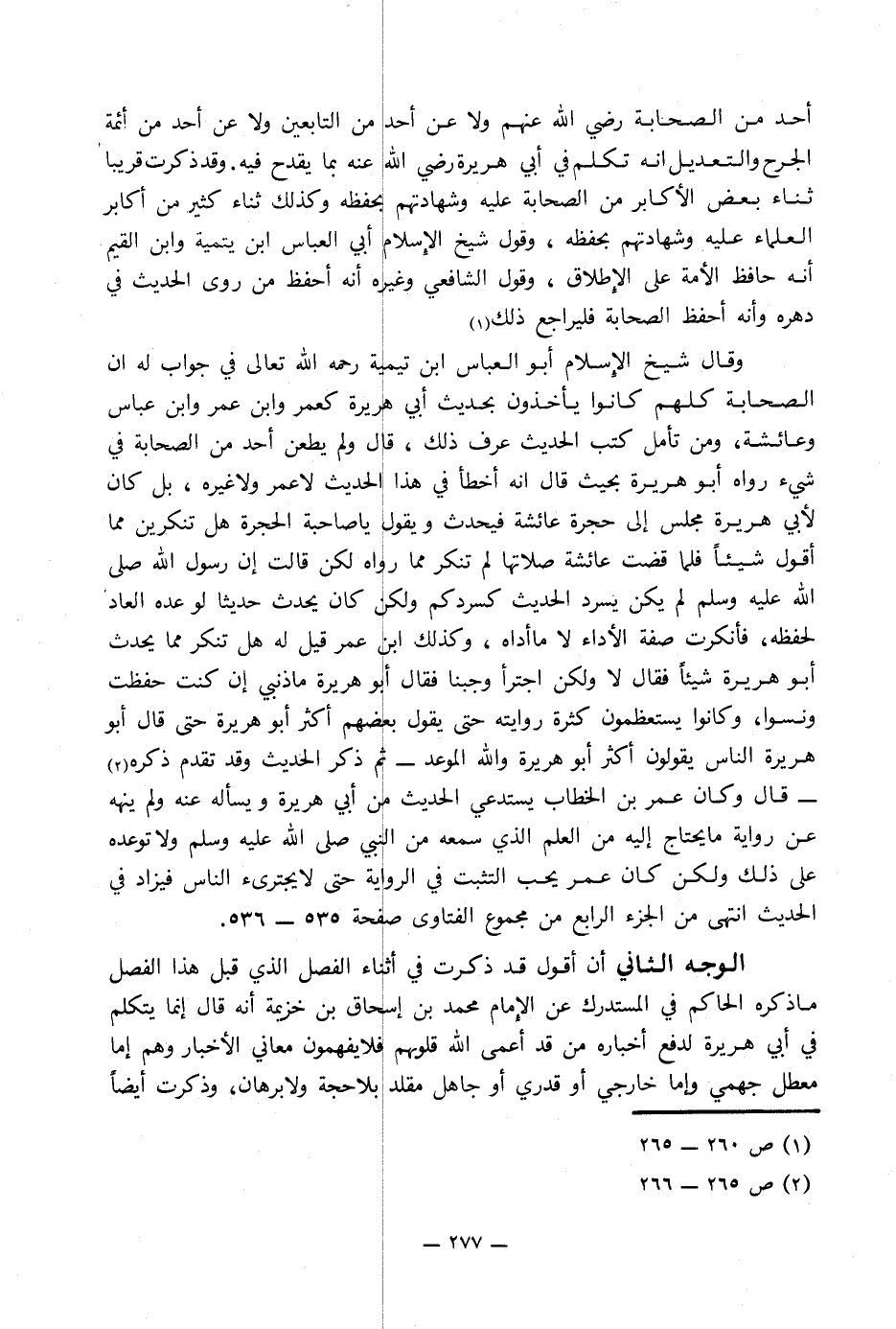 الوجه الثاني أن أقول قد ذكرت في أثناء الفصل الذي قبل هذا الفصل ما ذكره الحاكم في المستدرك عن الإِمام محمد بن إسحاق بن خزيمة أنه قال إنما يتكلم في أبي هريرة لدفع أخباره من قد أعمى الله قلوبهم فلا يفهمون معاني الأخبار وهم إما معطل جهمي وإما خارجي أو قدري أو جاهل مقلد بلا حجة ولا برهان, وذكرت أيضاً