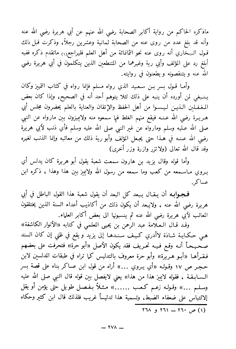 وأما قول بسر بن سعيد الذي رواه مسلم فإِنما رواه في كتاب التمييز وكان ينبغي لمن أورده أن ينبه على ذلك لئلا يتوهم أحد أنه في الصحيح, وإذا كان بعض المغفلين الذين ليسوا من أهل الحفظ والإِتقان والعناية بالعلم يحضرون مجلس أبي هريرة رضي الله عنه فيقع منهم الغلط فيما سمعوه ولا يميزون بين ما رواه عن النبي صلى الله عليه وسلم وما رواه عن غير النبي صلى الله عليه وسلم فأي ذنب لأبي هريرة رضي الله عنه في هذا حتى يجعل المؤلف وأبو رية ذلك من معائبه وإنما الذنب لغيره وقد قال الله تعالى (ولا تزر وازرة وزر أخرى).