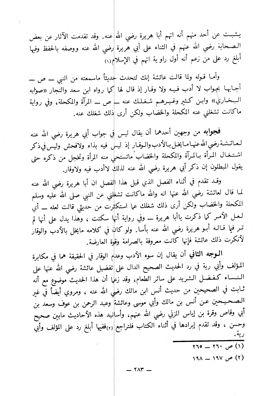 الوجه الثاني أن يقال إن سوء الأدب وعدم الوقار في الحقيقة هما في مكابرة المؤلف وأبي رية في رد الحديث الصحيح الدال على تفضيل عائشة رضي الله عنها على النساء كفضل الثريد على سائر الطعام, وقد زعما أن هذا الحديث موضوع مع أنه ثابت في الصحيحين من حديث أنس ابن مالك رضي الله عنه, ومروي أيضاً في غير الصحيحين عن أنس بن مالك وأبي موسى وعائشة وعبد الرحمن بن عوف وسعد بن أبي وقاص وقرة بن إياس المزني رضي الله عنهم, وأسانيد هذه الأحاديث ما بين صحيح وحسن, وقد تقدم إبرادها في أثناء الكتاب فلتراجع (¬2) ففيها أبلغ رد على المؤلف وأبي رية.