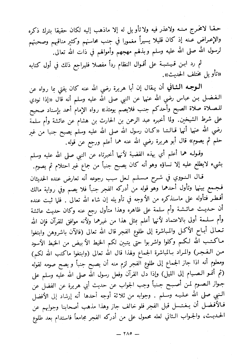 الوجه الثاني أن يقال إن أبا هريرة رضي الله عنه كان يفتي بما رواه عن الفضل بن عباس رضي الله عنهما عن النبي صلى الله عليه وسلم أنه قال «إذا نودي للصلاة صلاة الصبح وأحدكم جنب فلا يصم يومئذ» رواه الإِمام أحمد بإِسناد صحيح على شرط الشيخين. ولما أخبره عبد الرحمن بن الحارث بن هشام عن عائشة وأم سلمة رضي الله عنهما أنهما قالتا «كان رسول الله صلى الله عليه وسلم يصبح جنبا من غير حلم ثم يصوم» قال أبو هريرة رضي الله عنه هما أعلم ورجع عن قوله.