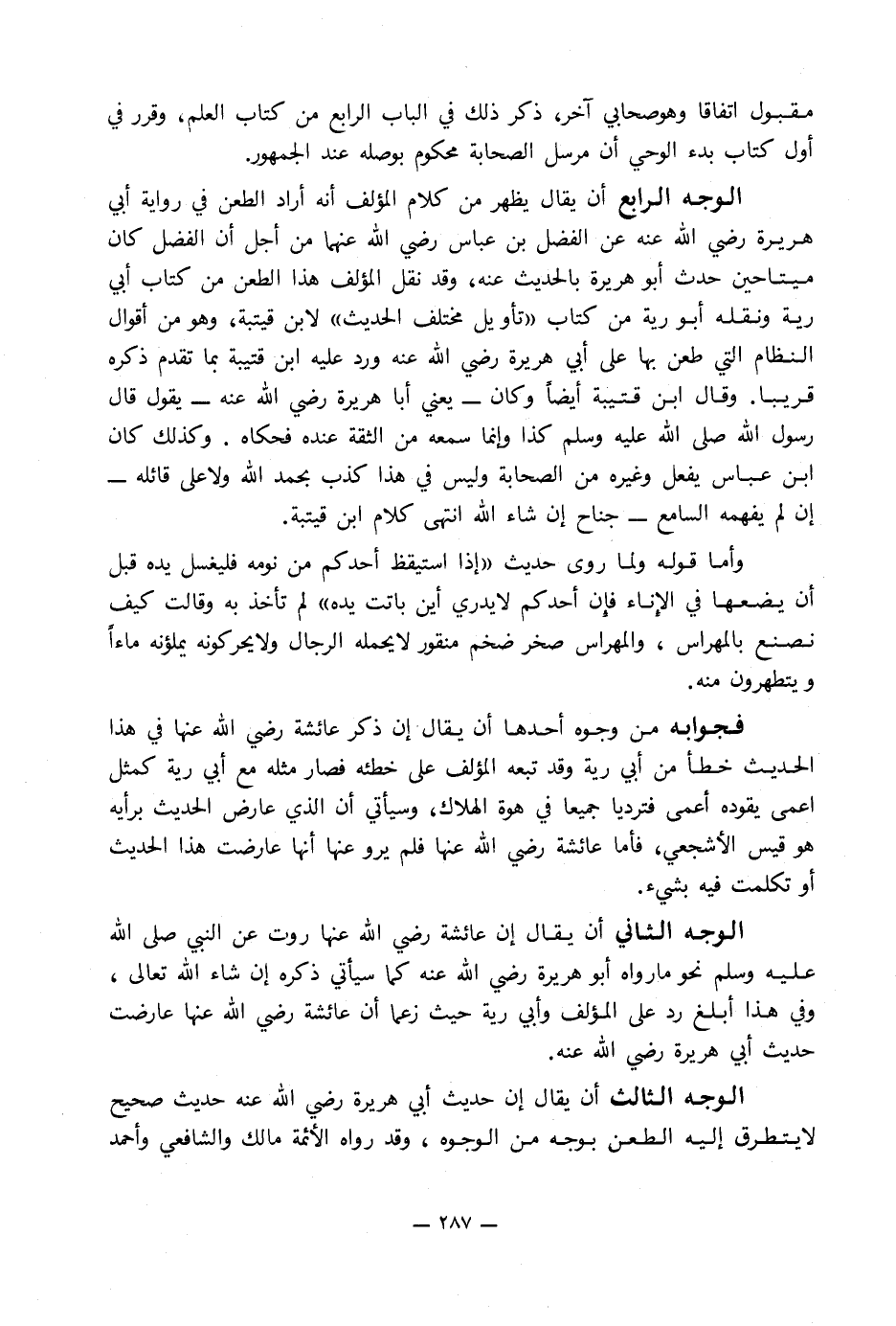 الوجه الثاني أن يقال إن عائشة رضي الله عنها روت عن النبي صلى الله عليه وسلم نحو ما رواه أبو هريرة رضي الله عنه كما سيأتي ذكره إن شاء الله تعالى, وفي هذا أبلغ رد على المؤلف وأبي رية حيث زعما أن عائشة رضي الله عنها عارضت حديث أبي هريرة رضي الله عنه.