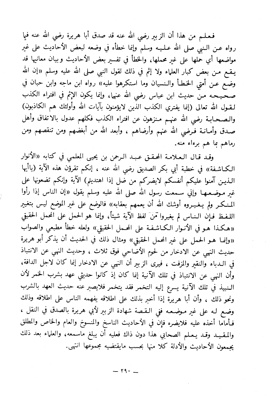 فعلم من هذا أن الزبير رضي الله عنه قد صدق أبا هريرة رضي الله عنه فيما رواه عن النبي صلى الله عليه وسلم وإنما خطأه في وضعه لبعض الأحاديث على غير مواضعها أي حملها على غير محملها, والخطأ في تفسير بعض الأحاديث وبيان معانيها قد يقع من بعض كبار العلماء ولا إثم في ذلك لقول النبي صلى الله عليه وسلم «إن الله وضع عن أمتي الخطأ والنسيان وما استكرهوا عليه» رواه ابن ماجه وابن حبان في صحيحه من حديث ابن عباس رضي الله عنهما, وإنما يكون الإِثم في افتراء الكذب لقول الله تعالى (إنما يفتري الكذب الذين لا يؤمنون بآيات الله وأولئك هم الكاذبون) والصحابة رضي الله عنهم منزهون عن افتراء الكذب فكلهم عدول بالاتفاق وأهل صدق وأمانة فرضي الله عنهم وأرضاهم, وأبعد الله من أبغضهم ومن تنقصهم ومن رماهم بما هم برءاء منه.