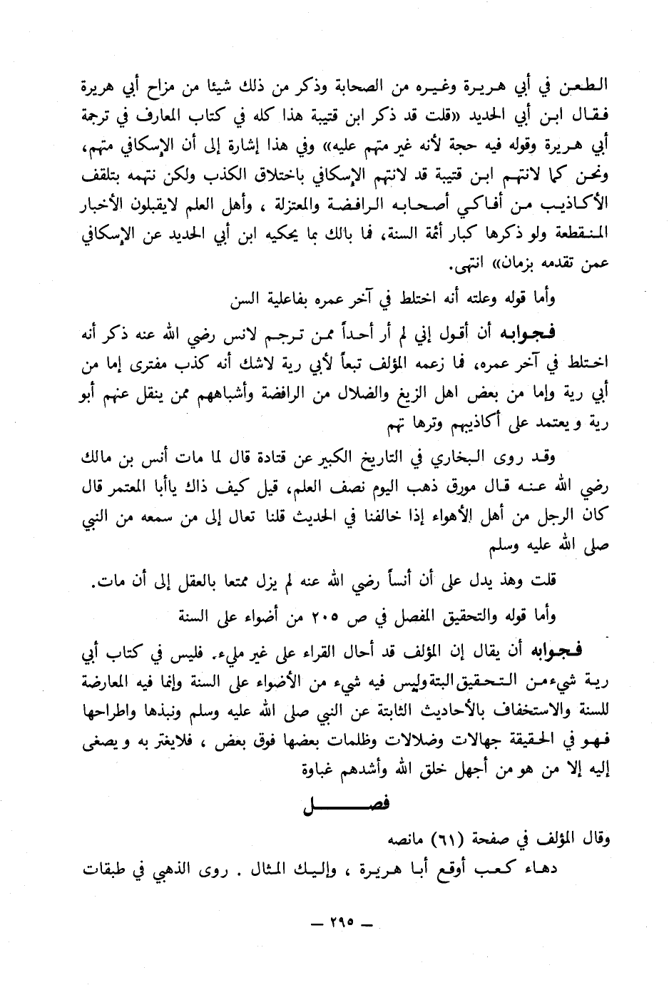 فجوابه أن يقال إن المؤلف قد أحال القراء على غير مليء. فليس في كتاب أبي رية شيء من التحقيق البتة وليس فيه شيء من الأضواء على السنة وإنما فيه المعارضة للسنة والاستخفاف بالأحاديث الثابتة عن النبي صلى الله عليه وسلم ونبذها واطراحها فهو في الحقيقة جهالات وضلالات وظلمات بعضها فوق بعض, فلا يغتر به ويصغي إليه إلا من هو من أجهل خلق الله وأشدهم غباوة.