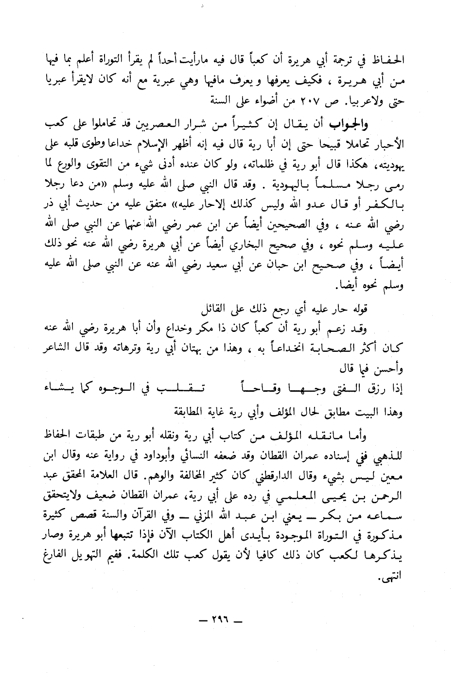 والجواب أن يقال إن كثيراً من شرار العصريين قد تحاملوا على كعب الأحبار تحاملا قبيحا حتى إن أبا رية قال فيه إنه أظهر الإِسلام خداعا وطوى قلبه على يهوديته, هكذا قال أبو رية في ظلماته, ولو كان عنده أدنى شيء من التقوى والورع لما رمى رجلا مسلماً باليهودية. وقد قال النبي صلى الله عليه وسلم «من دعا رجلا بالكفر أو قال عدو الله وليس كذلك إلا حار عليه» متفق عليه من حديث أبي ذر رضي الله عنه, وفي الصحيحين أيضاً عن ابن عمر رضي الله عنهما عن النبي صلى الله عليه وسلم نحوه, وفي صحيح البخاري أيضاً عن أبي هريرة رضي الله عنه نحو ذلك أيضاً, وفي صحيح ابن حبان عن أبي سعيد رضي الله عنه عن النبي صلى الله عليه وسلم نحوه أيضا.
