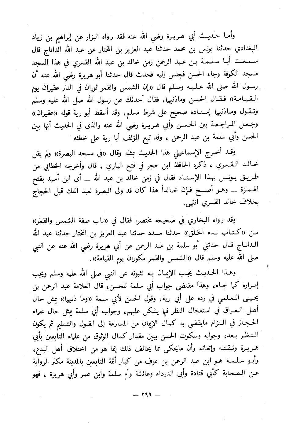 وأما حديث أبي هريرة رضي الله عنه فقد رواه البزار عن إبراهيم بن زياد البغدادي حدثنا يونس بن محمد حدثنا عبد العزيز بن المختار عن عبد الله الداناج قال سمعت أبا سلمة بن عبد الرحمن زمن خالد بن عبد الله القسري في هذا المسجد مسجد الكوفة وجاء الحسن فجلس إليه فحدث قال حدثنا أبو هريرة رضي الله عنه أن رسول الله صلى الله عليه وسلم قال «إن الشمس والقمر ثوران في النار عقيران يوم القيامة» فقال الحسن وما ذنبهما, فقال أحدثك عن رسول الله صلى الله عليه وسلم وتقول وما ذنبهما إسناده صحيح على شرط مسلم, وقد أسقط أبو رية قوله «عقيران» وجعل المراجعة بين الحسن وأبي هريرة رضي الله عنه والذي في الحديث أنها بين الحسن وأبي سلمة بن عبد الرحمن, وقد تبع المؤلف أبا رية على خطئه.
