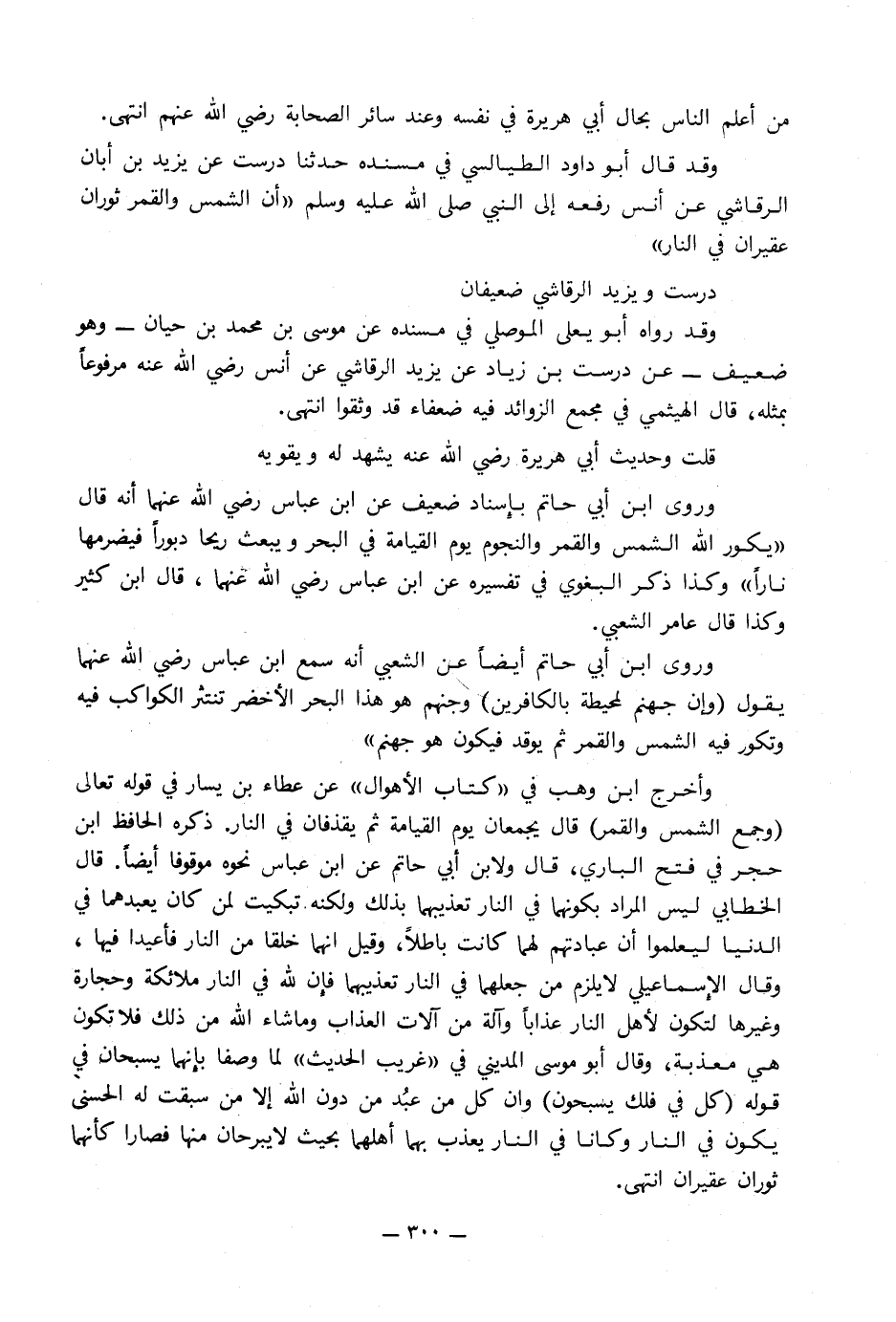 وأخرج ابن وهب في «كتاب الأهوال» عن عطاء بن يسار في قوله تعالى (وجمع الشمس والقمر) قال يجمعان يوم القيامة ثم يقذفان في النار. ذكره الحافظ ابن حجر في فتح الباري, قال ولابن أبي حاتم عن ابن عباس نحوه موقوفا أيضاً. قال الخطابي ليس المراد بكونهما في النار تعذيبهما بذلك ولكنه تبكيت لمن كان يعبدهما في الدنيا ليعلموا أن عبادتهم لهما كان باطلاً, وقيل إنهما خلقا من النار فأعيدا فيها, وقال الإِسماعيلي لا يلزم من جعلهما في النار تعذيبهما فإِن لله في النار ملائكة وحجارة وغيرها لتكون لأهل النار عذاباً وآلة من آلات العذاب وما شاء الله من ذلك فلا تكون هي معذبة, وقال أبو موسى المديني في «غريب الحديث» لما وصفا بأنهما يسبحان في قوله (كل في فلك يسبحون) وإن كل من عُبد من دون الله إلا من سبقت له الحسنى يكون في النار وكانا في النار يعذب بهما أهلهما بحيث لا يبرحان منها فصارا كأنهما ثوران عقيران انتهى.