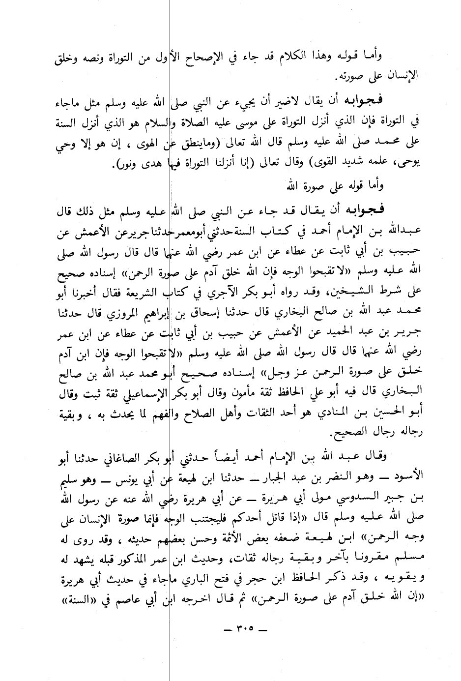 فجوابه أن يقال قد جاء عن النبي صلى الله عليه وسلم مثل ذلك قال عبد الله بن الإِمام أحمد في كتاب السنة حدثني أبو معمر حدثنا جرير عن الأعمش عن حبيب بن أبي ثابت عن عطاء عن ابن عمر رضي الله عنهما قال قال رسول الله صلى الله عليه وسلم «لا تقبحوا الوجه فإِن الله خلق آدم على صورة الرحمن» إسناده صحيح على شرط الشيخين, وقد رواه أبو بكر الآجري في كتاب الشريعة فقال أخبرنا أبو محمد عبد الله بن صالح البخاري قال حدثنا إسحاق بن إبراهيم المروزي قال حدثنا جرير بن عبد الحميد عن الأعمش عن حبيب بن أبي ثابت عن عطاء عن ابن عمر رضي الله عنهما قال قال رسول الله صلى الله عليه وسلم «لا تقبحوا الوجه فإِن ابن آدم خلق على صورة الرحمن عز وجل» إسناده صحيح أبو محمد عبد الله بن صالح البخاري قال فيه أبو علي الحافظ ثقة مأمون وقال أبو بكر الإِسماعيلي ثقة ثبت وقال أبو الحسين بن المنادي هو أحد الثقات وأهل الصلاح والفهم لما يحدث به, وبقية رجاله رجال الصحيح.