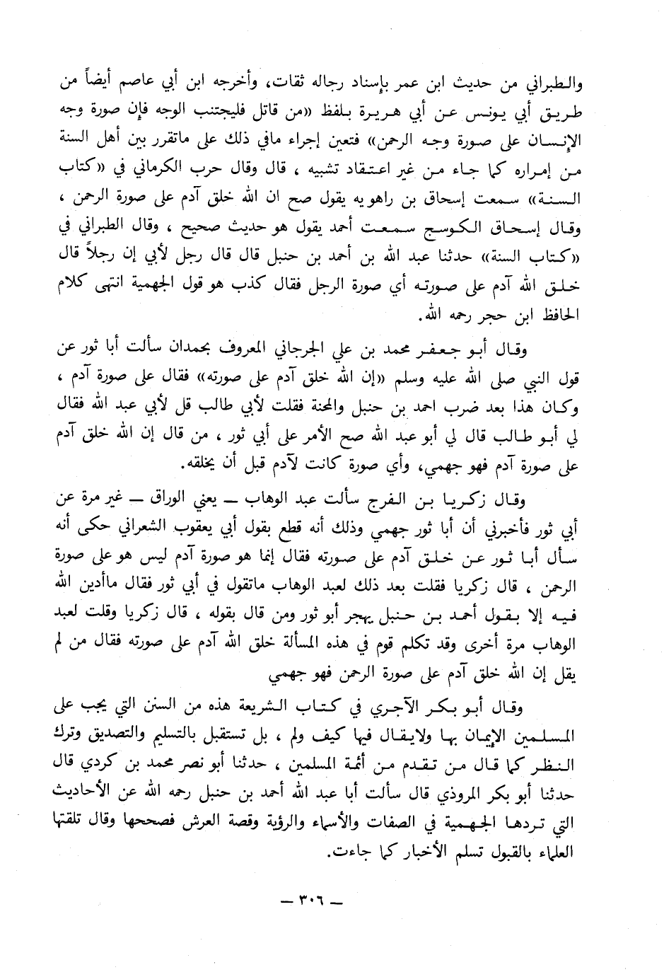 والطبراني من حديث ابن عمر بإِسناد رجاله ثقات, وأخرجه ابن أبي عاصم أيضاً من طريق أبي يونس عن أبي هريرة بلفظ «من قاتل فليجتنب الوجه فإِن صورة وجه الإِنسان على صورة وجه الرحمن» فتعين إجراء ما في ذلك على ما تقرر بين أهل السنة من إمراره كما جاء من غير اعتقاد تشبيه, قال وقال حرب الكرماني في «كتاب السنة» سمعت إسحاق بن راهويه يقول صح أن الله خلق آدم على صورة الرحمن, قال إسحاق الكوسج سمعت أحمد يقول هو حديث صحيح, وقال الطبراني في «كتاب السنة» حدثنا عبد الله بن أحمد بن حنبل قال قال رجل لأبي إن رجلاً قال خلق الله آدم على صورته أي صورة الرجل فقال كذب هو قول الجهمية انتهى كلام الحافظ ابن حجر رحمه الله.