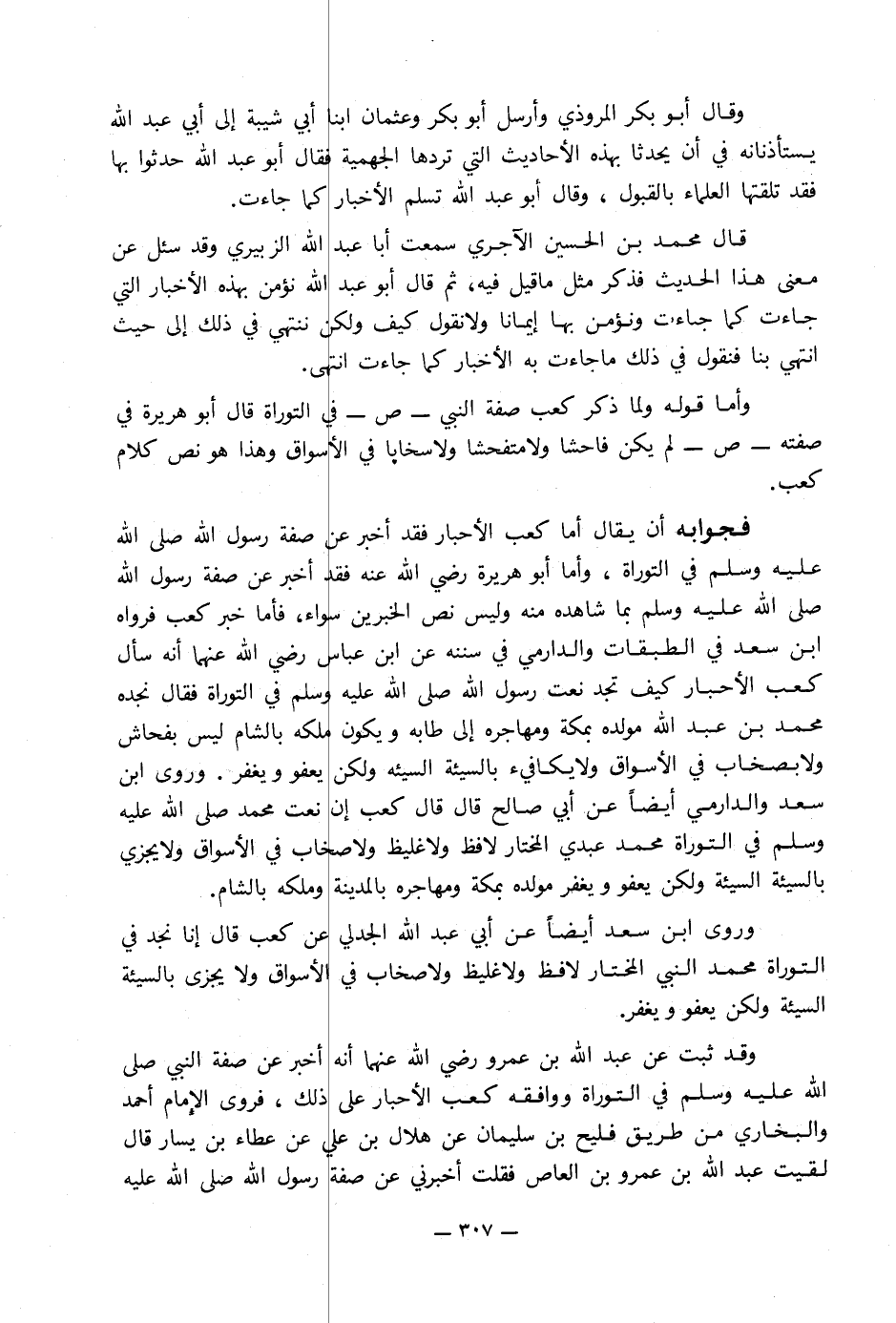 فجوابه أن يقال أما كعب الأحبار فقد أخبر عن صفة رسول الله صلى الله عليه وسلم في التوراة, وأما أبو هريرة رضي الله عنه فقد أخبر عن صفة رسول الله صلى الله عليه وسلم بما شاهده منه وليس نص الخبرين سواء, فأما خبر كعب فرواه ابن سعد في الطبقات والدارمي في سننه عن ابن عباس رضي الله عنهما أنه سأل كعب الأحبار كيف تجد نعت رسول الله صلى الله عليه وسلم في التوراة فقال نجده محمد بن عبد الله مولده بمكة ومهاجره إلى طابه ويكون ملكه بالشام ليس بفحاش ولا بصخاب في الأسواق ولا يكافئ بالسيئة السيئة ولكن يعفو ويغفر. وروى ابن سعد والدارمي أيضاً عن أبي صالح قال قال كعب إن نعت محمد صلى الله عليه وسلم في التوراة محمد عبدي المختار لافظ ولا غليظ ولا صخاب في الأسواق ولا يجزي بالسيئة السيئة ولكن يعفو ويغفر مولده بمكة ومهاجره بالمدينة وملكه بالشام.
