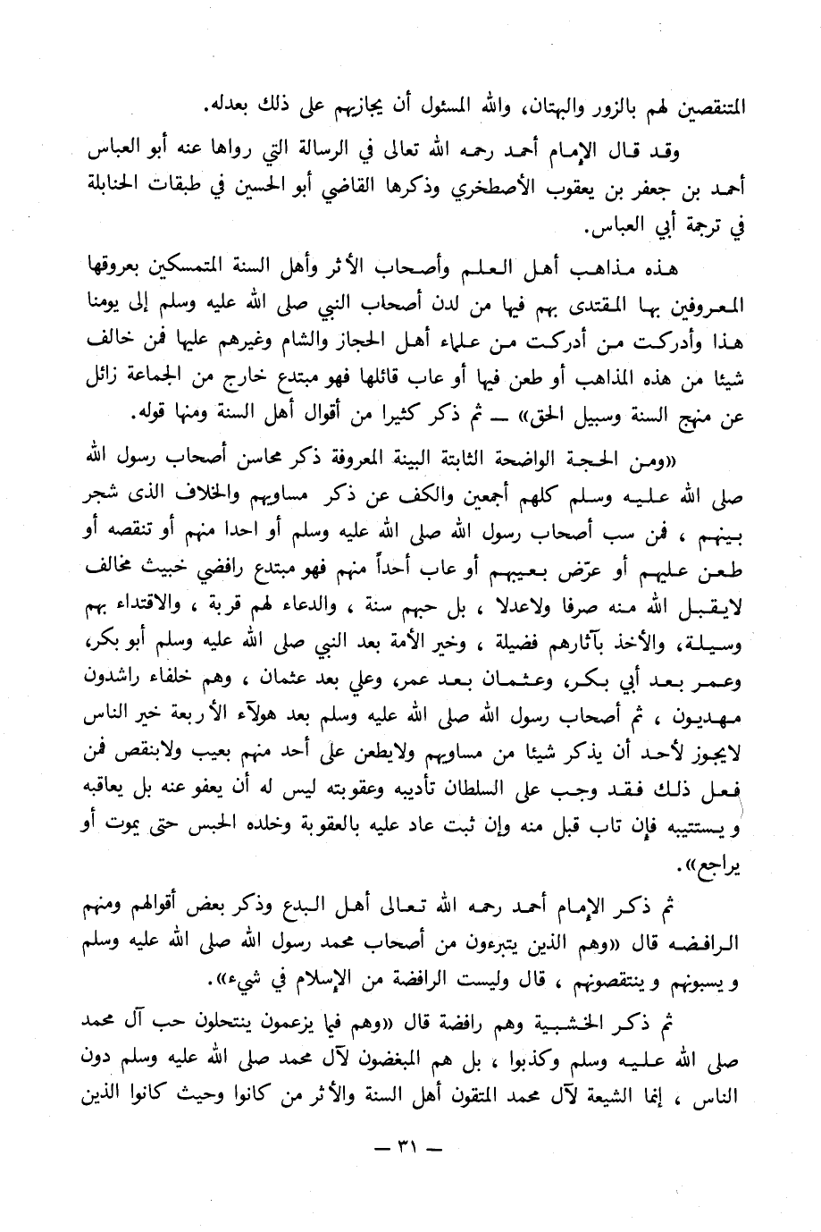 ثم ذكر الإِمام أحمد رحمه الله تعالى أهل البدع وذكر بعض أقوالهم ومنهم الرافضة قال «وهم الذين يتبرءون من أصحاب محمد رسول الله صلى الله عليه وسلم ويسبونهم وينتقصونهم, قال وليست الرافضة من الإِسلام في شيء».