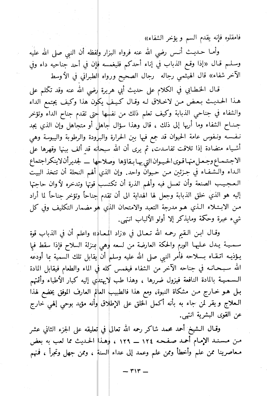 وقال ابن القيم رحمه الله تعالى في «زاد المعاد» واعلم أن في الذباب قوة سمية يدل عليها الورم والحكة والعارضة من لسعه وهي بمنزلة السلاح فإِذا سقط فيما يؤذيه اتقاه بسلاحه فأمر النبي صلى الله عليه وسلم أن يقابل تلك السمية بما أودعه الله سبحانه في جناحه الآخر من الشفاء فيغمس كله في الماء والطعام فيقابل المادة السمية بالمادة النافعة فيزول ضررها, وهذا طب لا يهتدي إليه كبار الأطباء وأئمتهم بل هو خارج من مشكاة النبوة, ومع هذا فالطبيب العالم العارف الموفق يخضع لهذا العلاج ويقر لمن جاء به بأنه أكمل الخلق على الإِطلاق وأنه مؤيد بوحي إلهي خارج عن القوى البشرية انتهى.